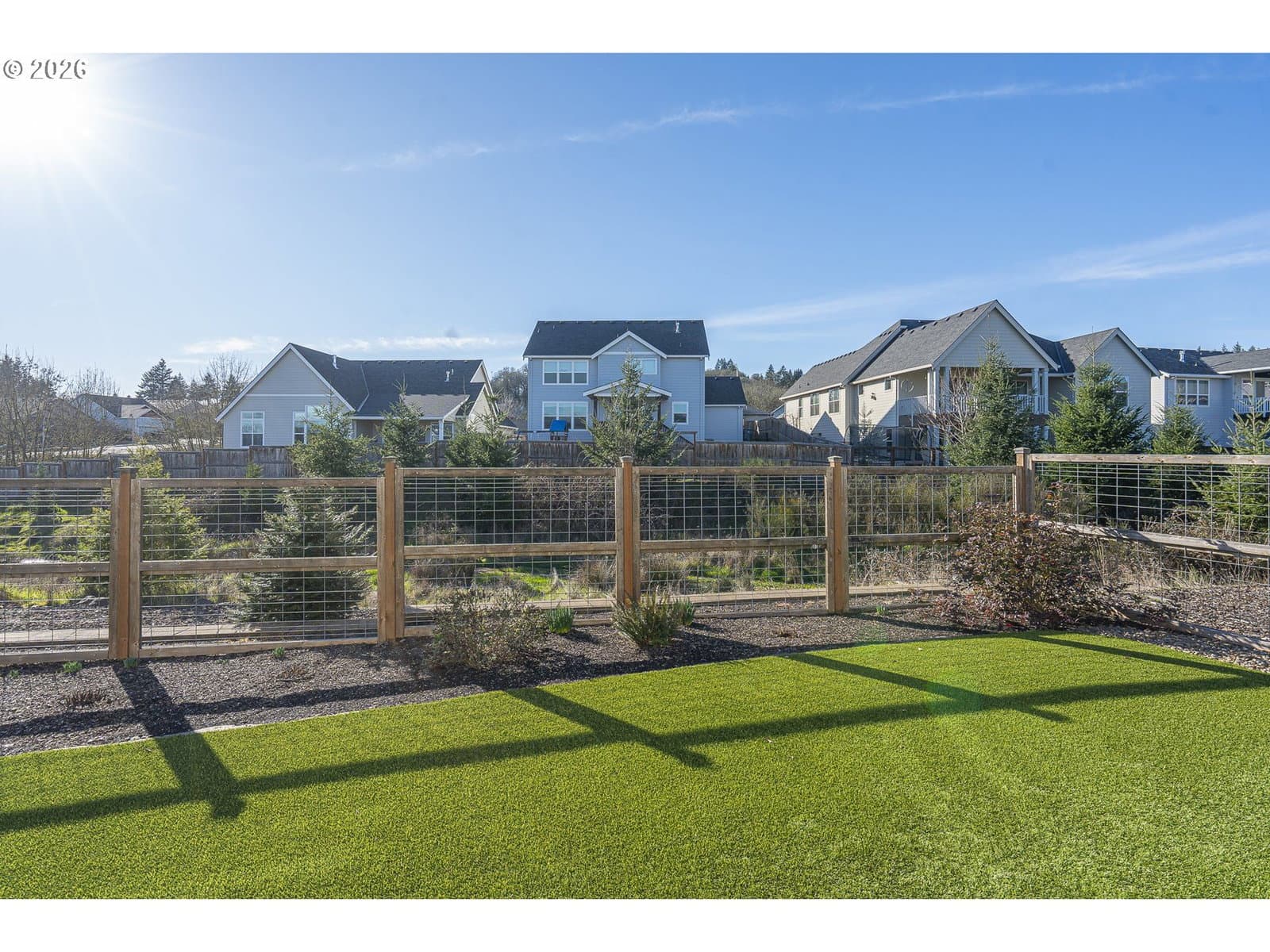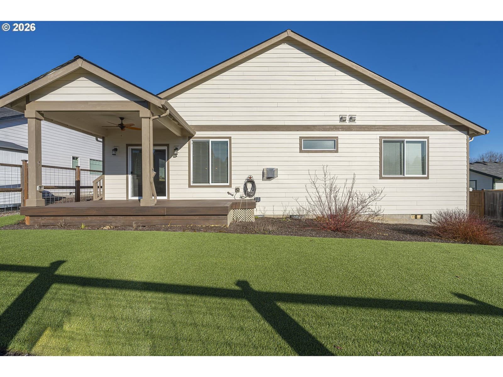 What you've been waiting for: Single level, high-end immaculate newer construction on nearly 1/3 acre in well-kept neighborhood near huge park with walking trails. Top-notch build with wood laminate floors, vaulted + 9' high ceilings, and best-of-both worlds floorplan that includes both a dedicated living room And a truly spacious great room. The entry is wide and welcoming with a generous veranda outside and wide foyer inside. The smartly equipped kitchen is composed of an oversize centerpiece granite island/breakfast bar, granite counters, soft-close cabinetry, full glass backsplash, and built-in under-cabinet lighting. The appliances are KitchenAid stainless, including solid surface electric range (plumbed for gas as well). Also on the awesome features list: Custom lighting with dimmers, central vacuum, A/C and gas fireplace with battery backup. The primary suite includes spacious walk-in closet, and both soak tub and walk-in shower. The laundry room has both sink and storage; washer and dryer included! Outside: Artificial turf means Never Mow Again! Sit back on your covered porch or covered Trex deck (with gas hookup for your BBQ -- no more hauling heavy tanks!)and enjoy the low-maintenance perennial border with built-in drip irrigation that blooms for you every year and the wildlife corridor beyond it, where deer, quail and the occasional turkey wander by. Like we said: This is what you've been waiting for.