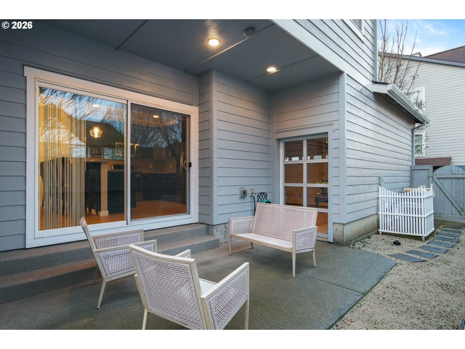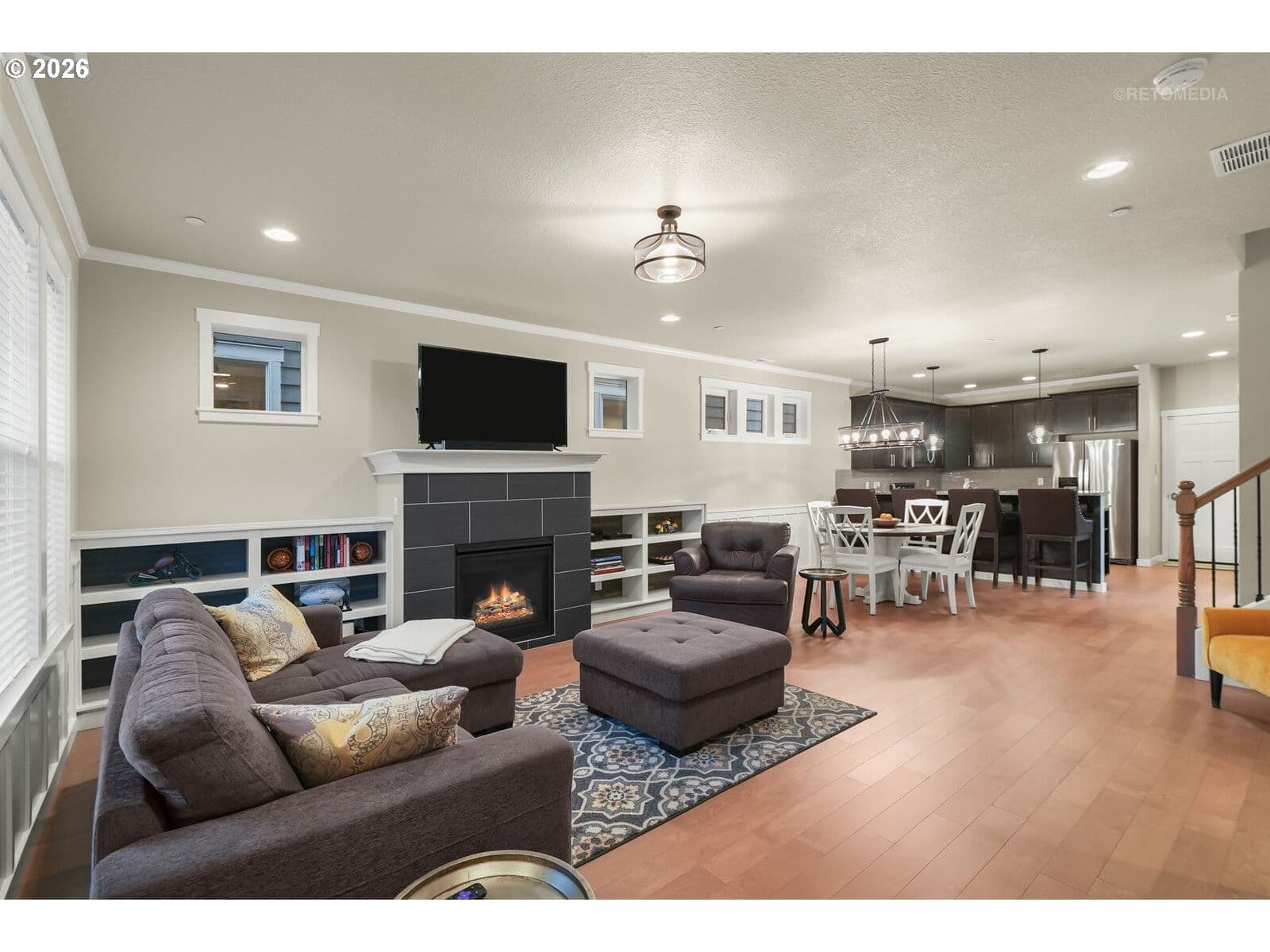Set in the heart of Wilsonville’s beloved Villebois community, this move-in ready JT Roth-built home offers effortless living in one of the area’s most sought-after neighborhoods. Thoughtfully designed and beautifully maintained, this barely lived-in residence features light-filled interiors, flexible living spaces, and a layout perfectly suited for today’s lifestyle. The main level showcases engineered hardwood floors, wainscoting, crown molding, and a welcoming living room with a custom tile surround gas fireplace and built-in shelving. The spacious great room flows seamlessly into the dining area, creating an ideal setting for gathering. The modern kitchen is equipped with granite countertops, stainless steel appliances, a pantry, and an eat-bar for casual meals and conversation. Indoor-outdoor living is made easy with a slider off the kitchen leading to a side patio, perfectly sized for grilling, outdoor seating, or even a hot tub. A unique retractable glass garage door opens directly to the patio, creating a fun entertaining space! Upstairs, the primary suite serves as a comfortable retreat with French door entry, a walk-in closet, and a private balcony. The primary bathroom features a dual-sink vanity, soaking tub, and a tile-wrapped walk-in shower. Two additional well-sized bedrooms, a hall bath, and a dedicated laundry room provide convenience. The third level offers exceptional versatility with a large bonus room featuring a wet bar, ideal for movie nights and game days, plus an office-flex room that can serve as a potential 4th bedroom, along with a half bath. Additional highlights include central air conditioning, blinds throughout, and a two-car garage with alley access. Enjoy all that Villebois has to offer, including tree-lined paths, parks, trails, sport courts, and a strong sense of community. Conveniently located to schools, shopping, dining, and major commuter routes, this home delivers comfort, flexibility, and an unbeatable Villebois lifestyle!