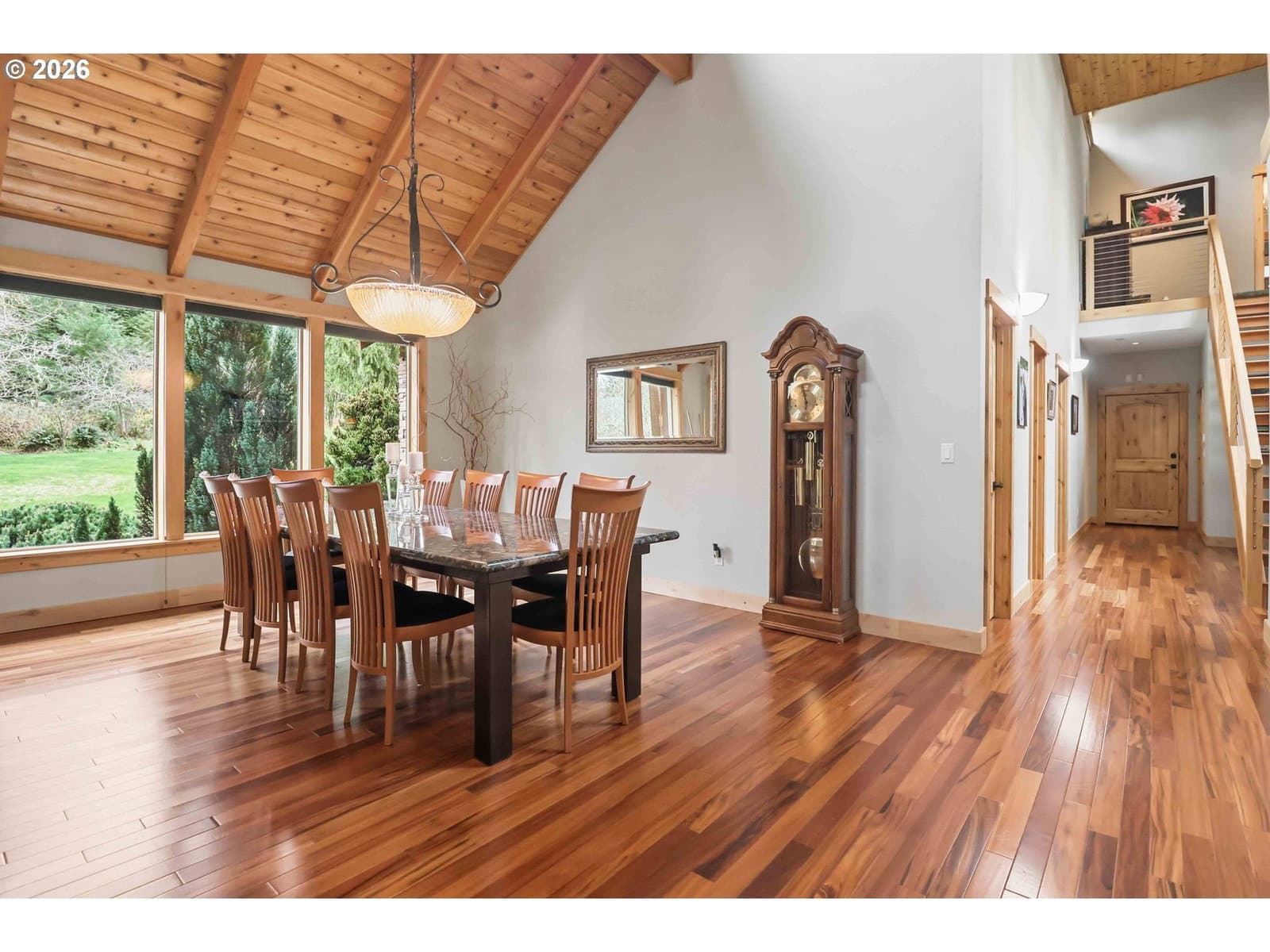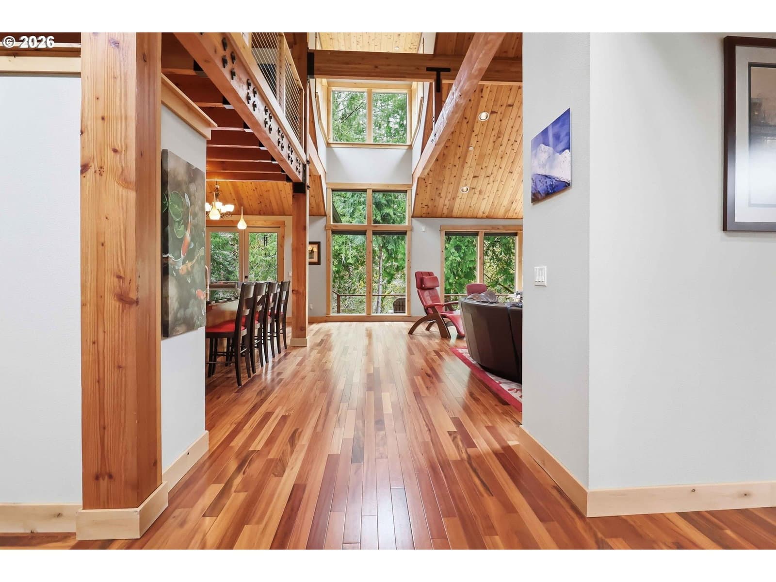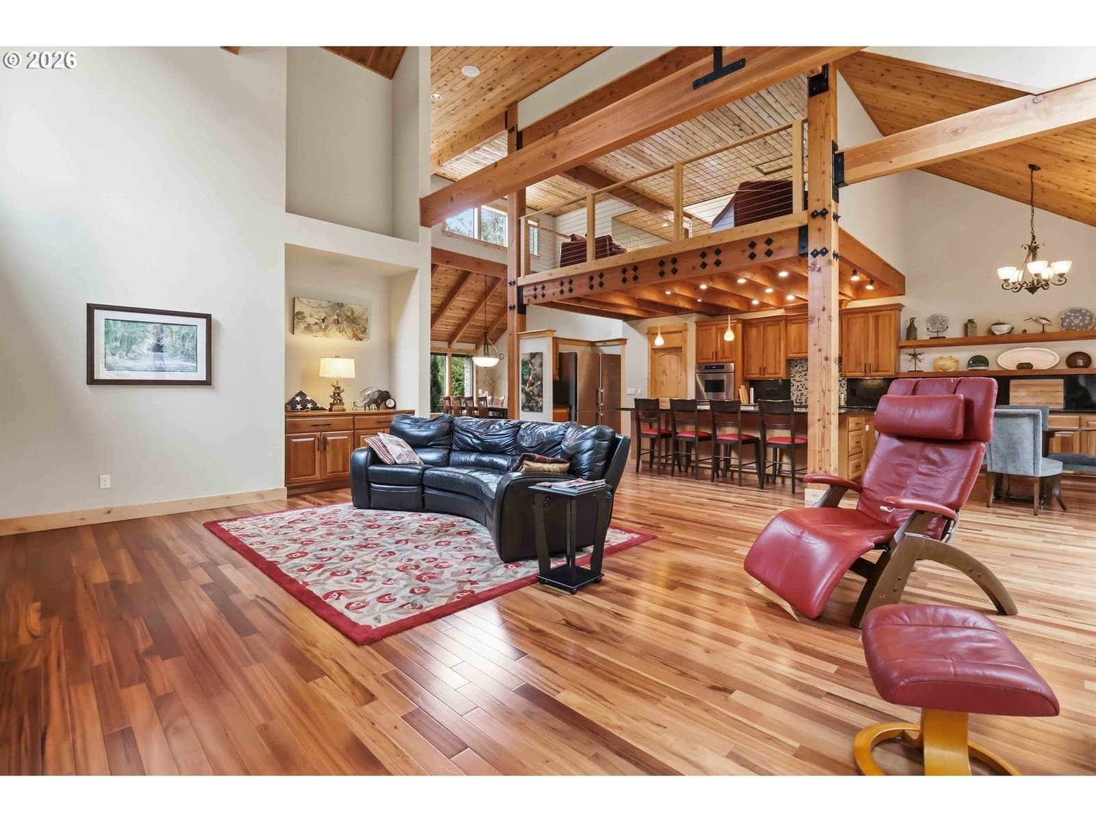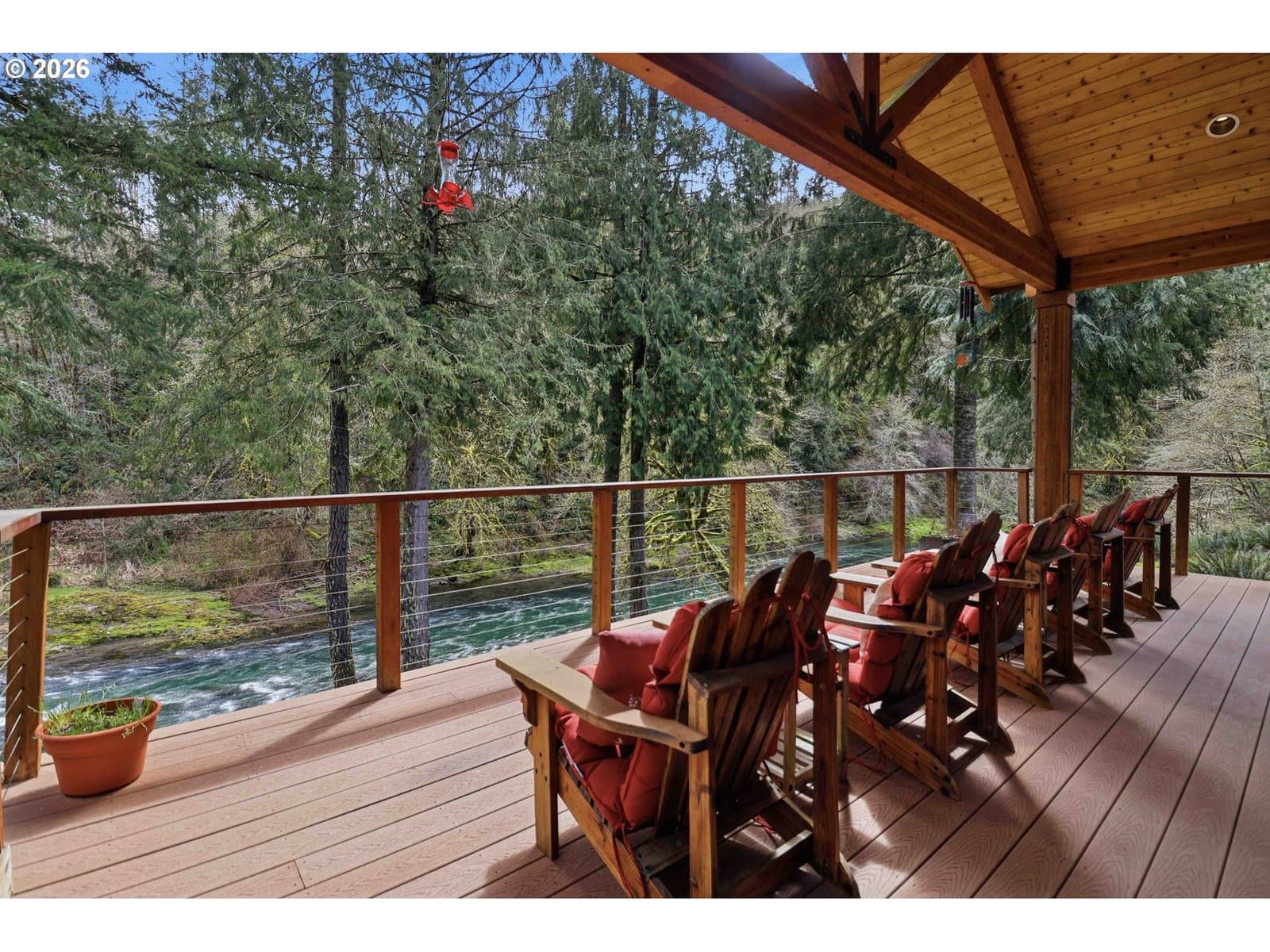 Experience exceptional riverfront living on the Kalama River. Situated on 2.76 private acres with approximately 620 feet of frontage, this 4,051 sq ft custom home offers 3 bedrooms and 4 bathrooms in a peaceful, natural setting just minutes from the well-known “Holy Waters” stretch. Inside, the home features Brazilian tigerwood floors, vaulted cedar-lined ceilings, exposed beams, and custom ironwork that bring out a strong Northwest feel with real craftsmanship throughout. Expansive windows take in river, territorial, and mountain views while bringing in natural light. The layout offers comfortable living spaces and multiple primary suites, making it easy to live in or host. Step outside to Trex decking overlooking the river and a natural waterfall, creating a private setting for relaxing or entertaining. The 1,502 sq ft detached pool house includes a heated indoor lap pool, 650-gallon jacuzzi, and 3/4 bath, set up for year-round use. Additional features include a 3-car garage, extra parking, RV space, high-speed fiber internet, and landscaped grounds with garden space and fruit trees. A unique opportunity to own a riverfront property with acreage and resort-style features in one of Southwest Washington’s most desirable areas.