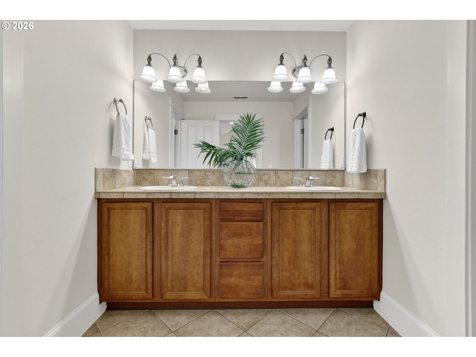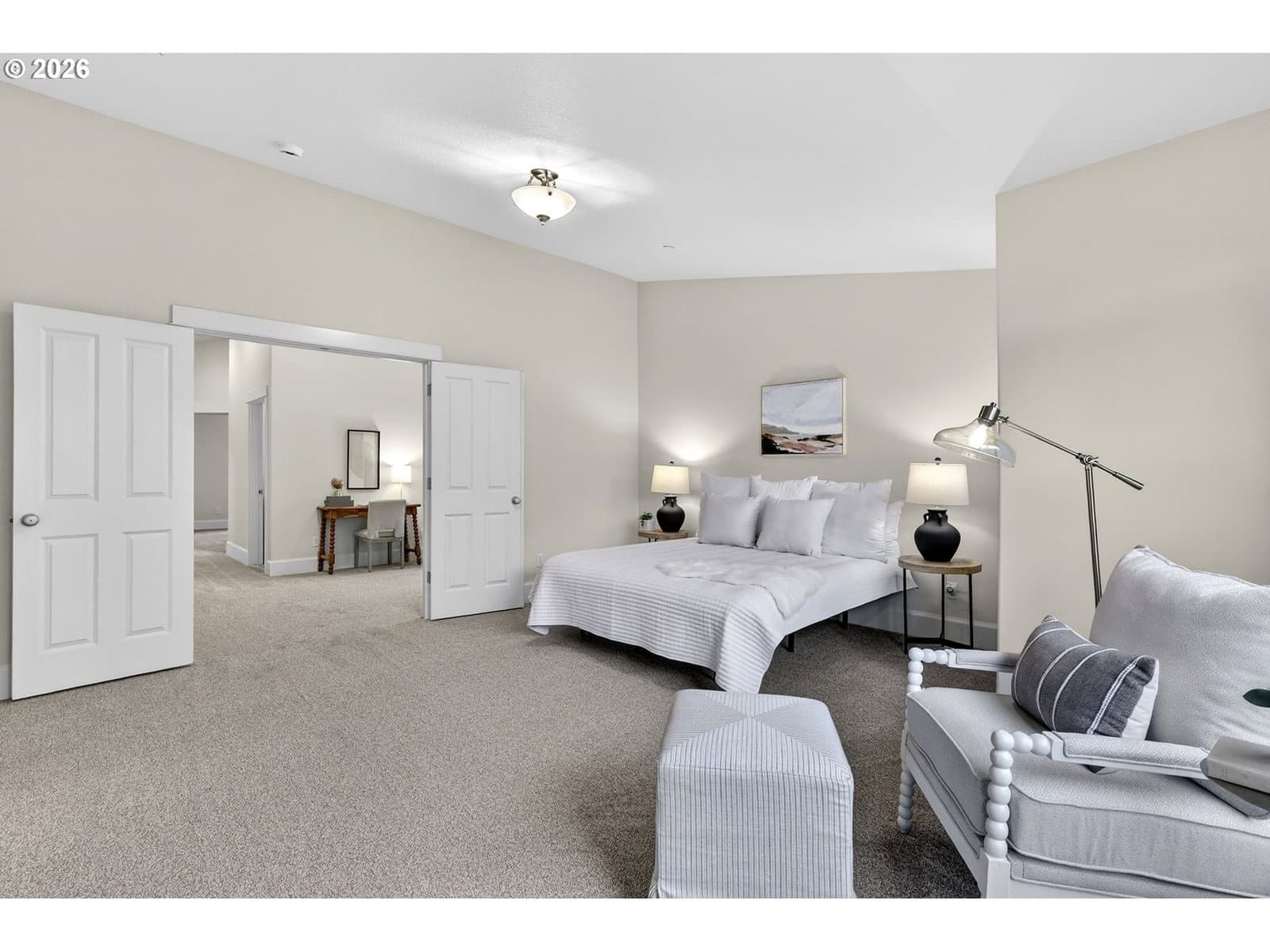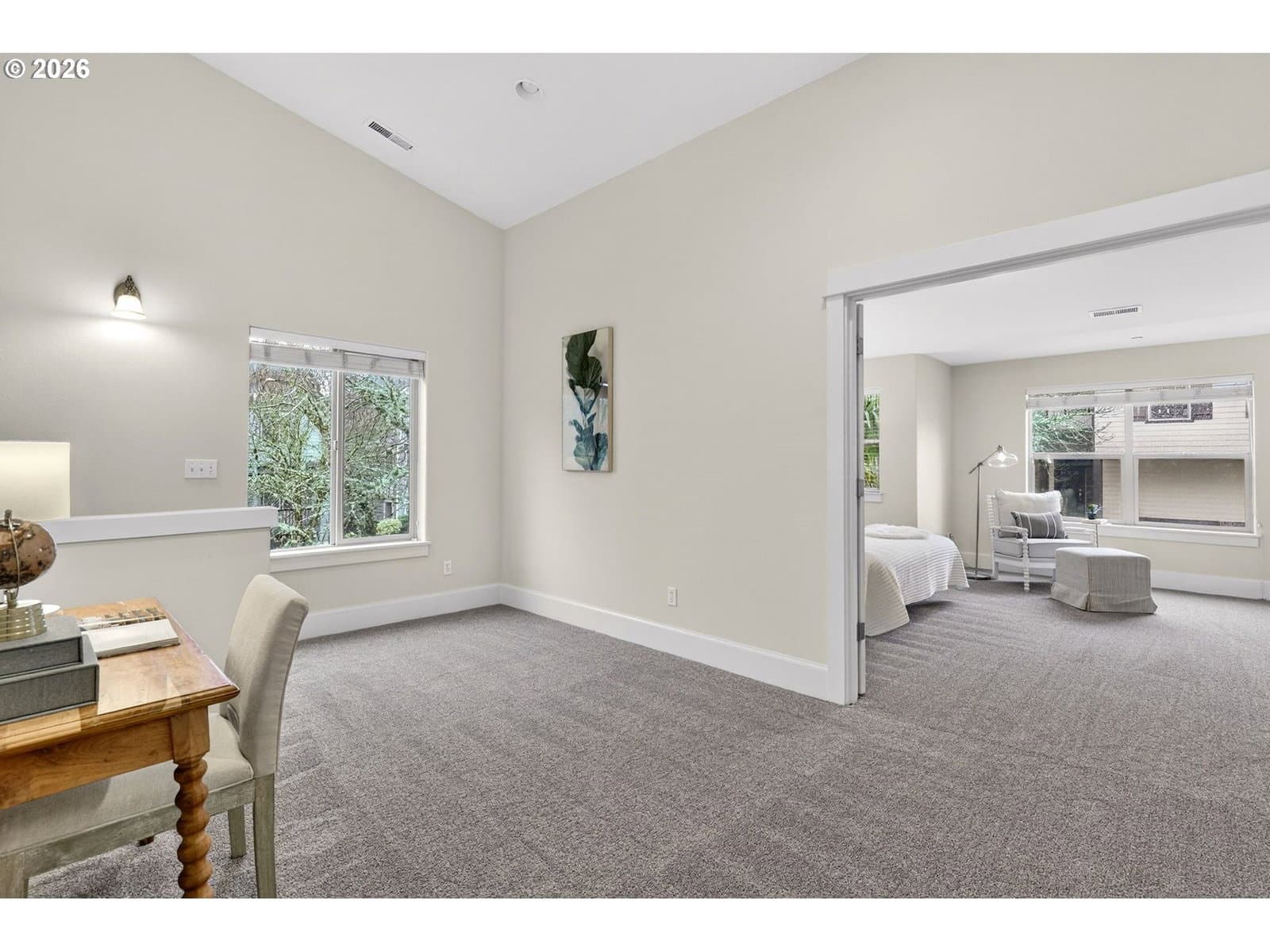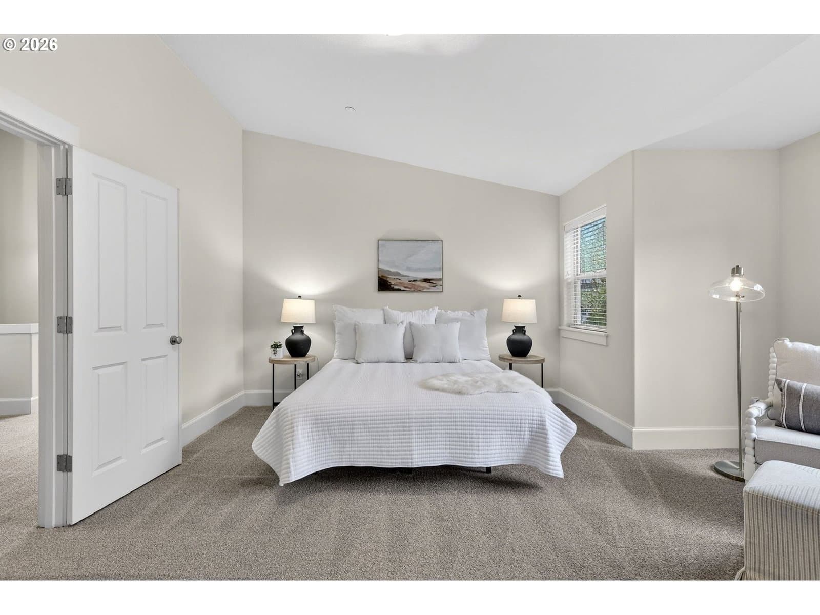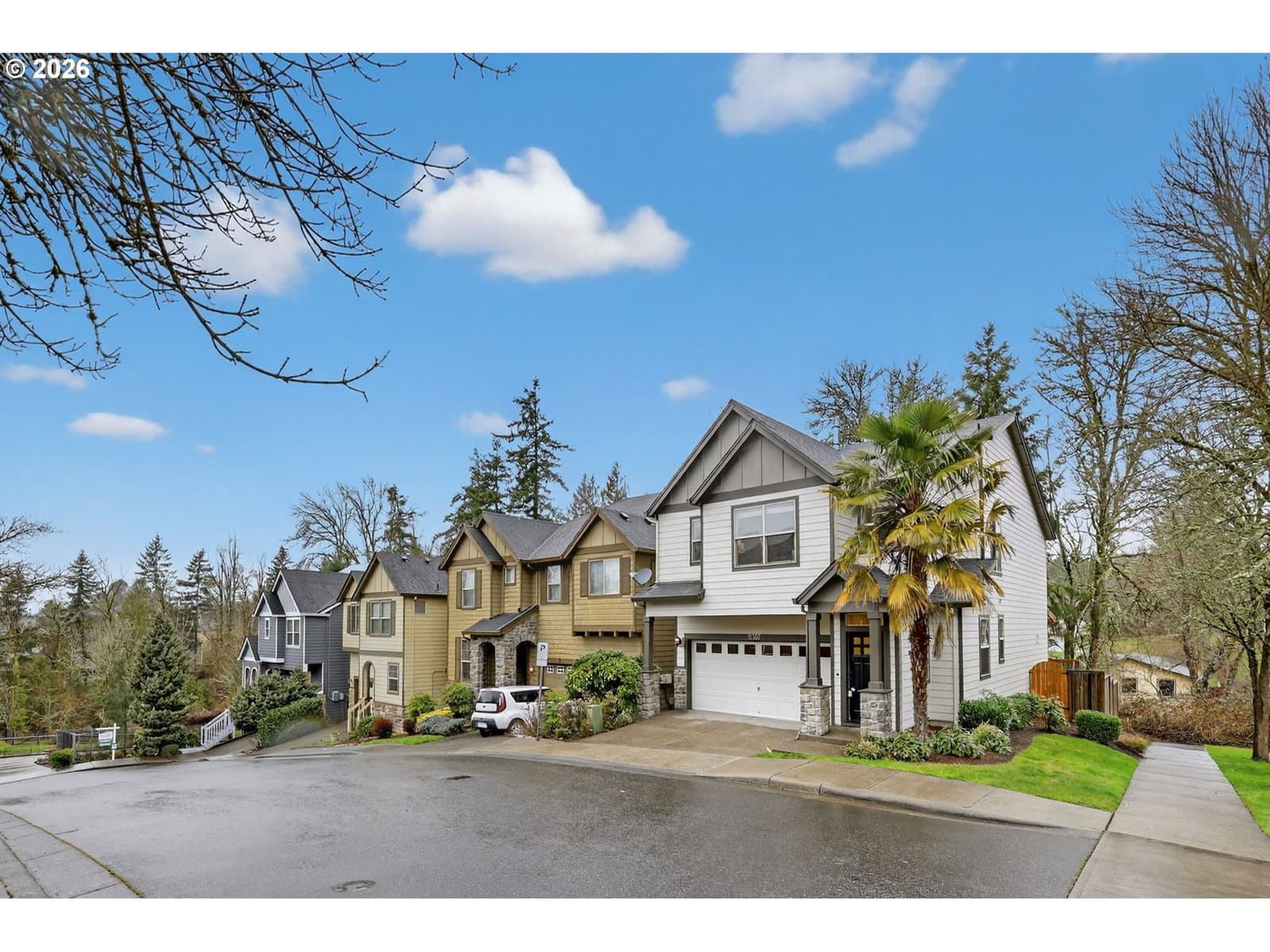 Beautifully updated traditional corner home backing to greenspace and tucked at the end of an undeveloped dead-end road, offering added privacy and a quieter setting. Fresh updates include new carpet, refinished cherry hardwood floors, and fresh interior and exterior paint. Covered front porch with stone accents opens to a welcoming foyer with hardwoods and coat closet. Open-concept living room features soaring ceilings and a cozy corner fireplace. Fantastic kitchen with granite tile countertops, tile backsplash, cherry cabinetry, stainless steel appliances, pantry, and large eat-in island. Dining area opens to a partially covered, freshly painted deck overlooking the peaceful greenspace. Upstairs includes a versatile vaulted loft, spacious primary suite with French doors, vaulted ceilings, sitting area, and ensuite bath. Two additional vaulted bedrooms share a full hall bath, and convenient upper-level laundry offers built-in shelving. Finished two-car garage and fenced yard complete the home. Ideally located near Bonny Slope Elementary, St. Pius X School, Lost Park, and easy highway access.