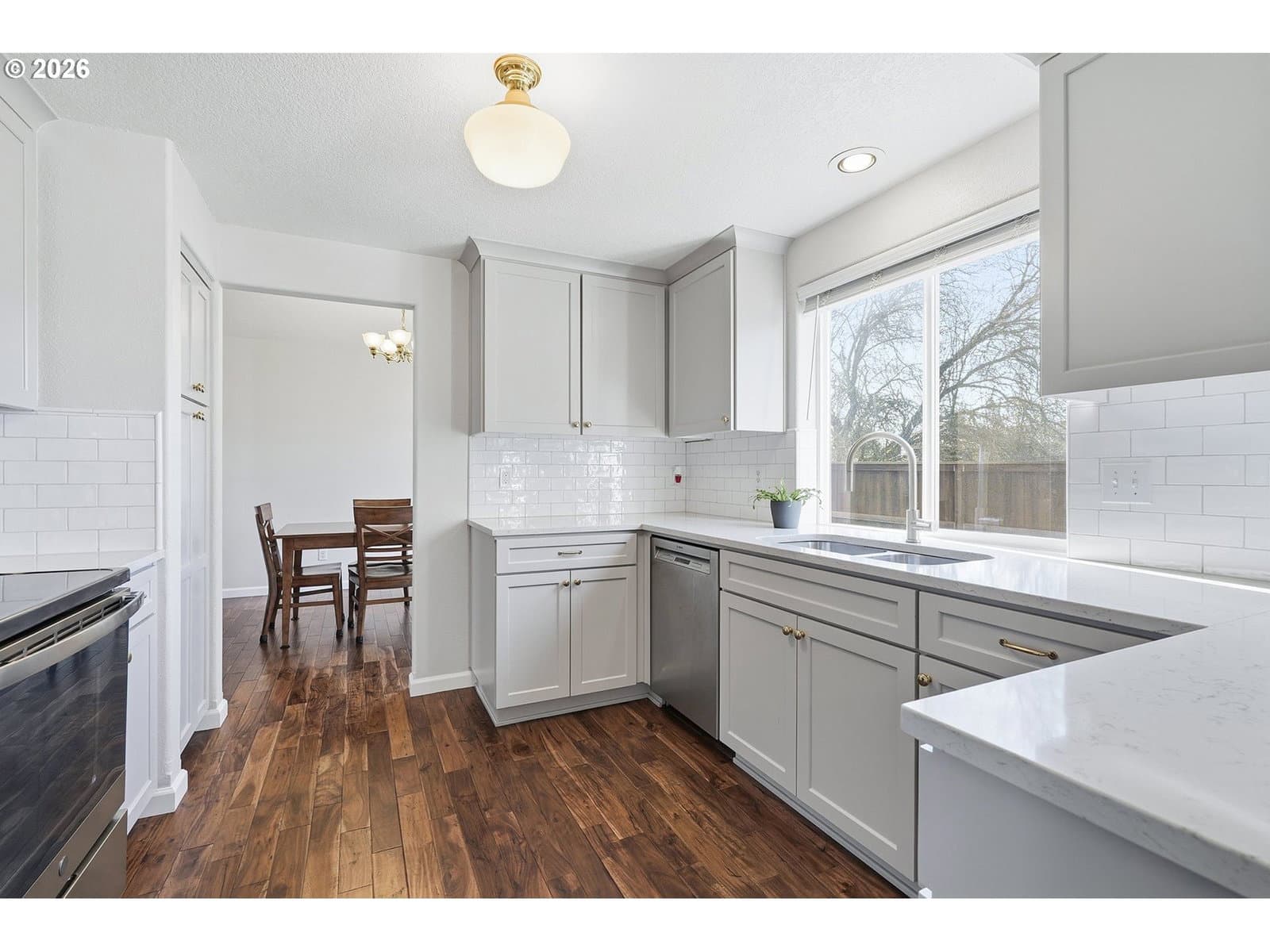 Meticulously cared for traditional style 2-story in the heart of Beaverton. Walk into the main floor adorned with stunning hardwood floors (2021), vaulted ceilings, and two living spaces for flexible family living. Freshly renovated kitchen with no expense spared including new appliances, farmhouse sink and gorgeous quartz countertops. Find 2 spacious bedrooms upstairs as well as a primary suite equipped with a walk-in closet and full bath. Step outside to find a sun soaked deck surrounded by low maintenance backyard with blooming rose bushes, rosemary, and daffodils. Summertime plantings bring raspberries, blueberries, strawberries, and 3 variations of apples in the private courtyard. Access Reedville Trail greenbelt through custom fence dutch door for miles of walking, running, cycling or park access. No systems untouched : New 50yr Roof w/transferrable warranty (2016), Furnace / AC (2021), hot water tank (2017). Homes with this level of care and investment rarely become available, don't miss your chance to call it yours!