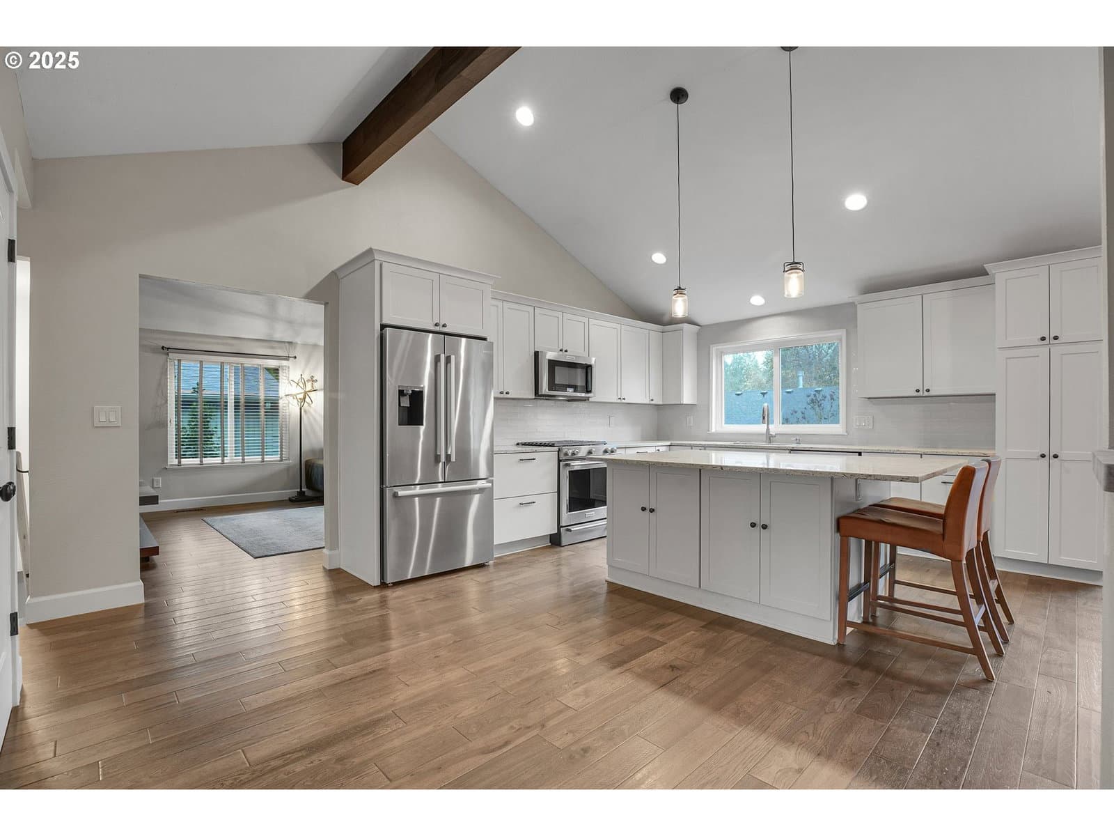 Incredible remodel of this SW PDX daylight ranch.Oversized driveway with lots of parking along with extra on street spots. Discover the perfect blend of modern updates in this beautifully updated daylight ranch. Located in a close-in Portland neighborhood, this home offers a quick, easy commute to Downtown and is walkable to Jackson Middle School. The home spans 2,326 square feet and features an open-concept main level with dramatic, vaulted ceilings that enhance the kitchen, dining, and living room spaces. The meticulous, top-to-bottom remodel includes: Fully updated kitchen with new cabinets, quartz countertops, stainless appliances and modern finishes. Three completely updated bathrooms, hardwoods on the main floor and new LVP flooring downstairs (except bedrooms)4 bedrooms, plus a flexible 5th bedroom/office on the lower level, ideal for remote work, guests, or a playroom. Peace of mind comes with newer mechanicals and structural updates include newer roof (2017), HVAC (2021), air conditioner (2017), hot water heater (2017). The outdoor living space features a large deck and paver patio, a fully fenced, low-maintenance turf backyard.