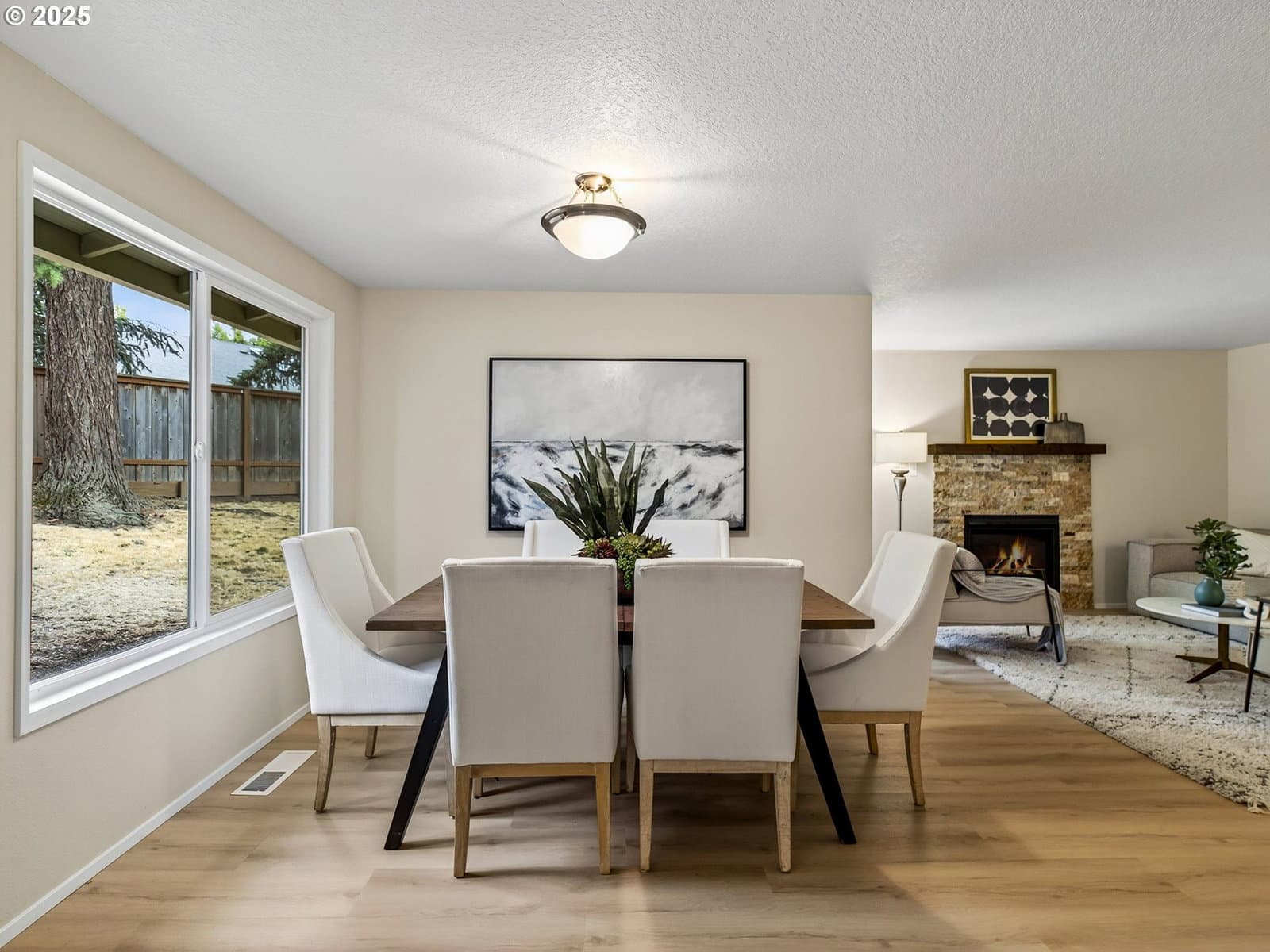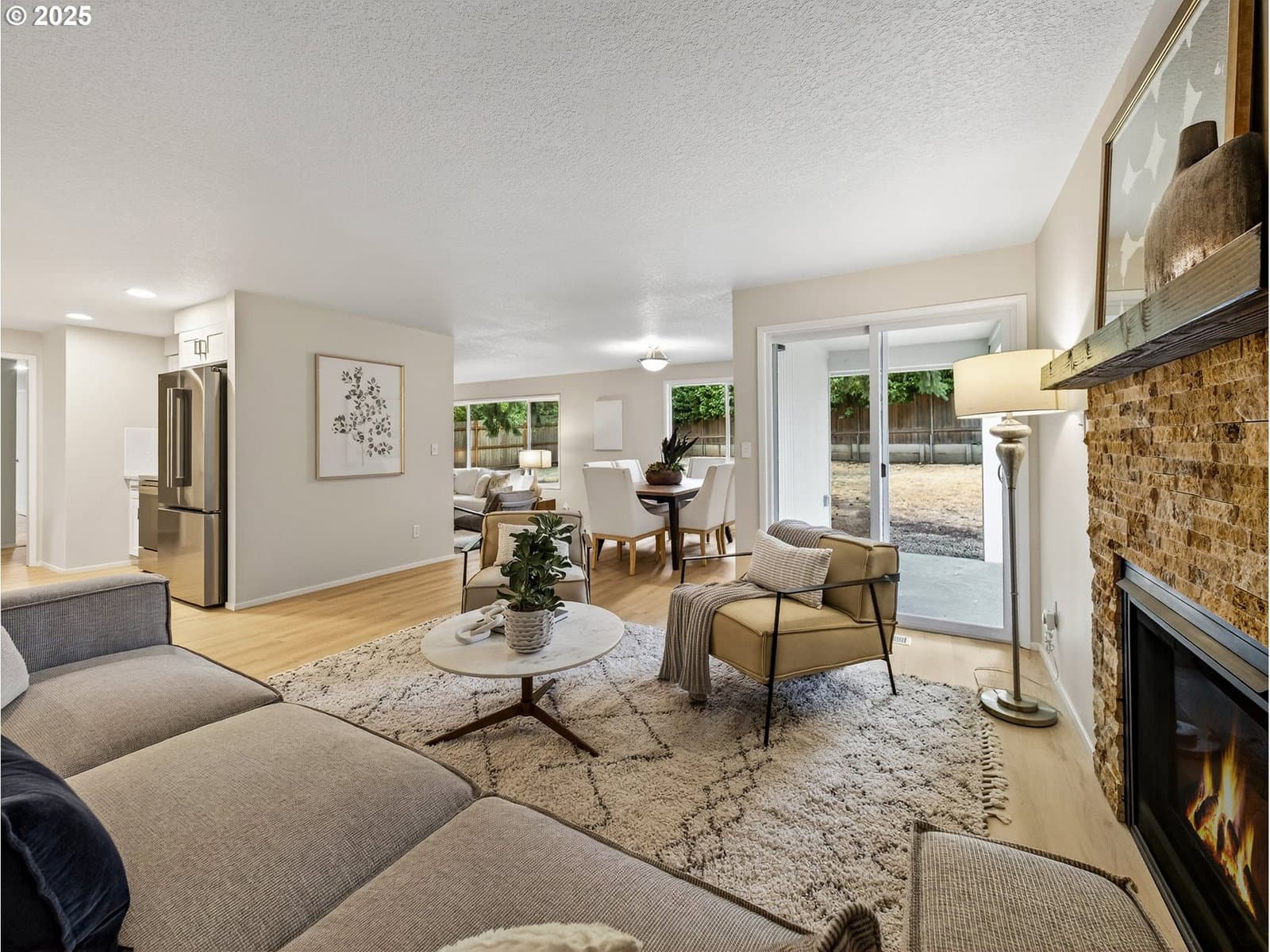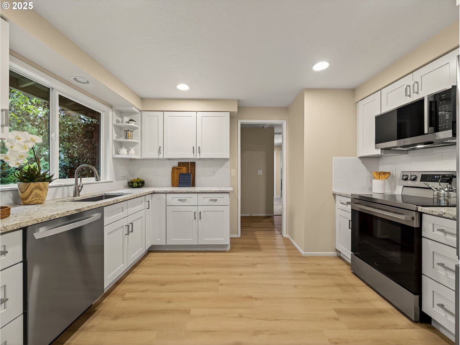Welcome to this stunning single-story contemporary home, thoughtfully updated and quietly nestled on a private cul-de-sac. Fully renovated in 2025, this move-in ready gem features fresh interior and exterior paint, offering a clean and modern look throughout. Enjoy the comfort of a new HVAC system—perfect for keeping cool in summer and cozy all year round. The home showcases luxury vinyl plank flooring throughout the main living areas, with plush carpet in the bedrooms for added warmth and comfort. The remodeled kitchen is equipped with stainless steel appliances, including a freestanding refrigerator, induction cook top electric range, built-in microwave, and dishwasher. Shaker-style cabinetry with soft-close drawers and a deep stainless-steel sink with disposal add both style and function. Both the primary and guest bathrooms have been renovated with modern finishes, creating spa-like spaces for relaxation. The cozy gas fireplace in the family room provides the perfect focal point for gatherings or quiet evenings in. Step outside to enjoy private, fully fenced back and side yards—ideal for entertaining, gardening, or relaxing in peace. Located just minutes from the 25-acre Hyland Woods Park and scenic walking trails, and close to the Beaverton Farmers Market, downtown dining, shops, and cafés.