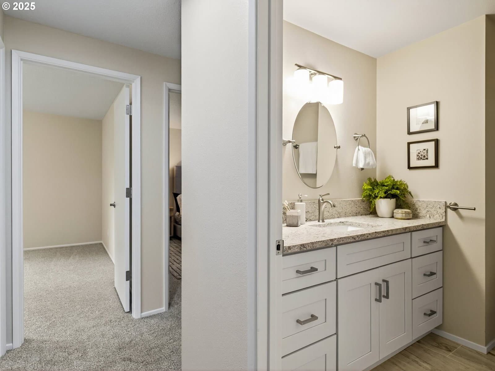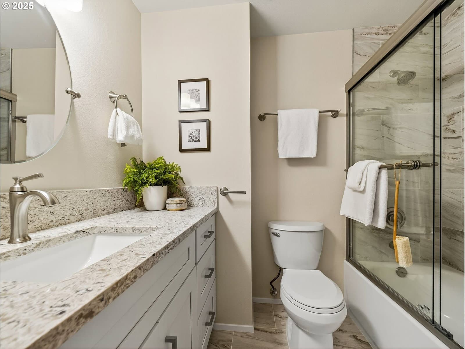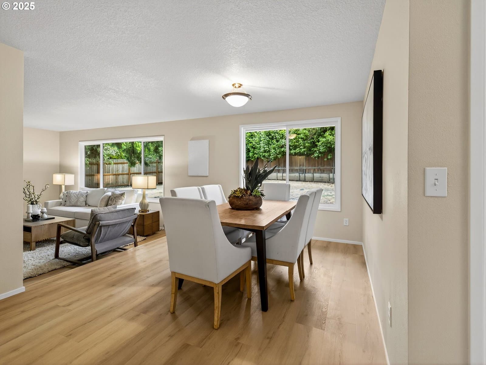 Welcome to this stunning single-story contemporary home, thoughtfully updated and quietly nestled on a private cul-de-sac. Fully renovated in 2025, this move-in ready gem features fresh interior and exterior paint, offering a clean and modern look throughout. Enjoy the comfort of a new HVAC system—perfect for keeping cool in summer and cozy all year round. The home showcases luxury vinyl plank flooring throughout the main living areas, with plush carpet in the bedrooms for added warmth and comfort. The remodeled kitchen is equipped with stainless steel appliances, including a freestanding refrigerator, induction cook top electric range, built-in microwave, and dishwasher. Shaker-style cabinetry with soft-close drawers and a deep stainless-steel sink with disposal add both style and function. Both the primary and guest bathrooms have been renovated with modern finishes, creating spa-like spaces for relaxation. The cozy gas fireplace in the family room provides the perfect focal point for gatherings or quiet evenings in. Step outside to enjoy private, fully fenced back and side yards—ideal for entertaining, gardening, or relaxing in peace. Located just minutes from the 25-acre Hyland Woods Park and scenic walking trails, and close to the Beaverton Farmers Market, downtown dining, shops, and cafés.