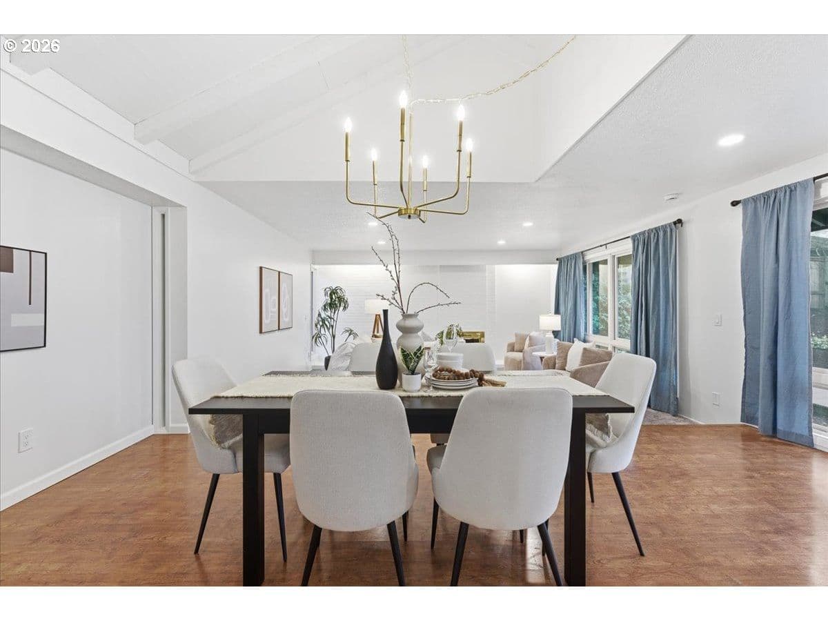 Mid-century charm meets modern updates in the coveted Four Seasons neighborhood. This rare one-level 1969 home welcomes you with a double-door entry, vaulted dining area, and a sunken living room with a white fireplace featuring a wall-to-wall mantle and soft backlighting. Walls of windows fill the home with natural light and the kind of character you simply can't find often. The kitchen offers tiled countertops, gold accents, and a pass-through to the pop-out breakfast nook window perfect for greenery. Just beyond, a cozy family room opens to the brick patio. The spacious primary suite includes mirrored closet doors and a recently updated bathroom with a tiled walk-in shower. Two additional bedrooms and a modernized hall bath round out the thoughtfully designed single-level layout. Major improvements make this home truly move-in ready, including a new $50K roof with 30-year warranty, new gutter guards, a new composite front deck, fresh interior paint, new microwave, and updated bathroom vanities, faucets, and lighting. Low-maintenance bark-dust landscaping and mature trees let the architecture shine. Enjoy a peaceful HOA setting with trees, creeks, a clubhouse, and pool, all just minutes from Cedar Hills Crossing with shopping and eateries, downtown Beaverton, Nike, and Hwy 217.