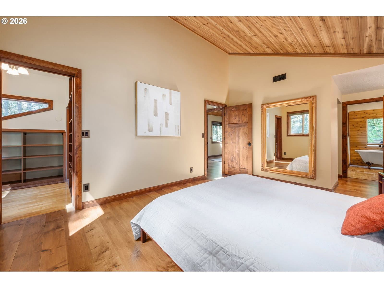 Set on a wooded acre off of Spring Blvd in southeast Eugene, this property immerses you in private wooded setting, and then surprises and delights with luxurious finishes and obvious care throughout every space. The entry sets the tone with Italian Luna travertine and wood-clad vaulted ceilings, opening naturally into the main living spaces, which is anchored by a Napoleon wood stove for heat, and a wood burning fireplace for ambiance. The kitchen balances function and presence with imported Italian porcelain tile, a commercial-grade BlueStar gas range, custom bamboo cabinetry, granite counters, and a large island. The primary suite is generous in scale, with double walk-in closets and vaulted wood ceilings adding warmth without excess. In addition it has a primary bathroom that reads more like a personal spa. An oversized travertine shower with marine varnished cedar ceiling and a cast iron clawfoot tub create a beautiful contrast in texture and tone. Solid travertine counters, paneled accent wall and double copper sinks continue that layered, high end material approach. Throughout the home: maple engineered hardwoods from South America, hand-stained knotty alder doors and trim, updated outlets and dimmers with polished brass covers, and fresh interior paint. Outdoor living is equally considered with expansive Trex decking with a designer metal railing and a covered outdoor kitchen featuring granite counters, a Blaze Professional natural gas BBQ and a built in Green Egg. A finished bonus room above the garage with its own ductless heat pump, new carpet, and built-in desk adds flexibility for work, guests, or separation of space when needed. Major updates include roof (2023), tankless water heater and HVAC (2021), vinyl windows (2021), exterior paint (2020), and new fencing (2025). Don't miss this property where setting, materials, and updates come together in a way that feels intentional and lasting.