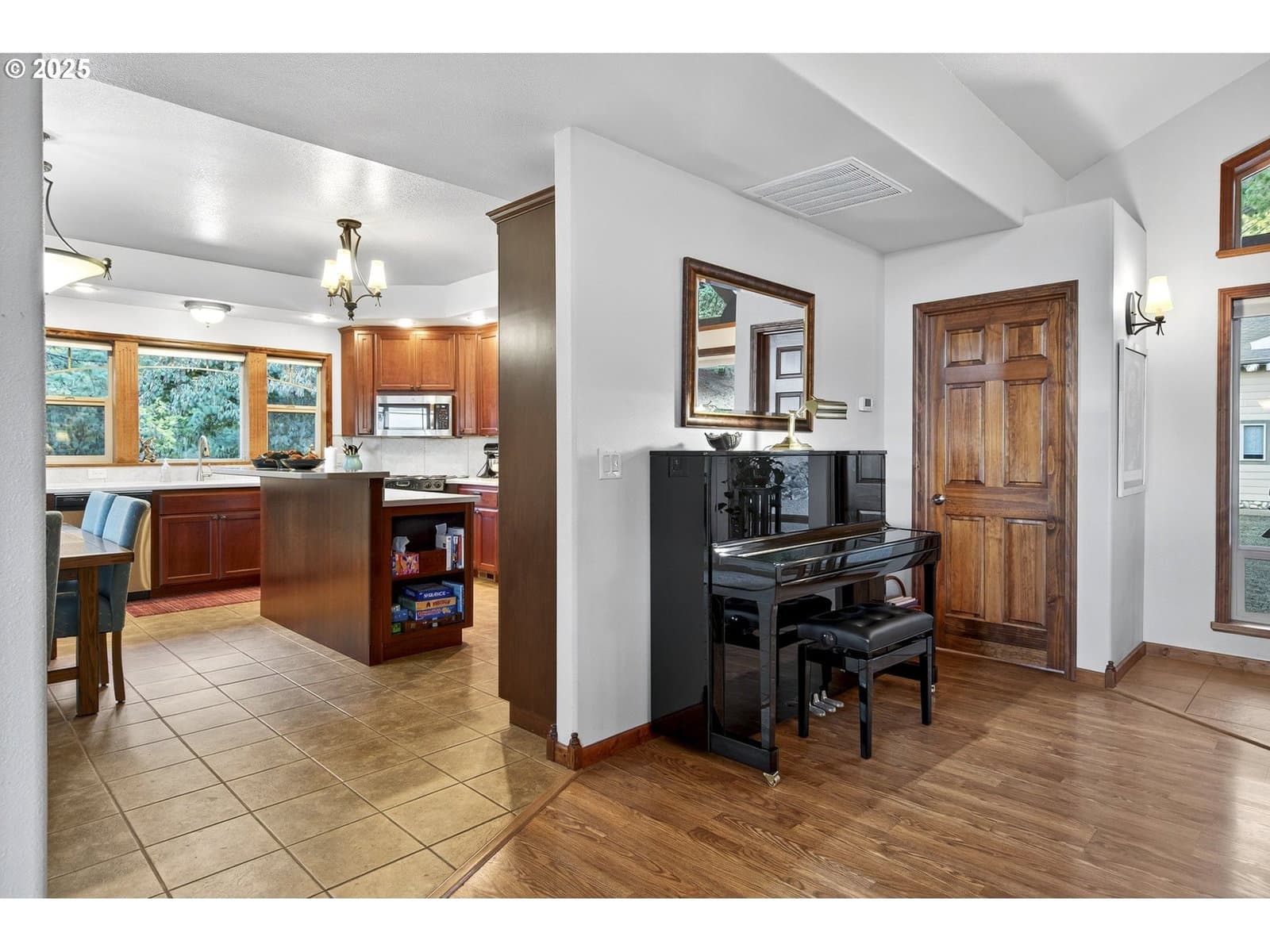 This property offers a truly beautiful and private setting with outstanding views. The home welcomes you with a grand entrance featuring a large rustic staircase. Both the scenic views and a river rock fireplace draw you into the living room, which boasts vaulted ceilings.The primary suite is a serene retreat, complete with sliding doors that open to a private deck, two walk-in closets, and an en-suite bathroom offering a separate tub, shower, and double vanity. The kitchen and dining room also feature sliding doors, providing seamless access to the main deck, perfect for entertaining or enjoying the outdoors. Practical amenities include a double-car attached garage and an impressive 28 x 50 shop with a full bathroom and laundry hook-up. Additionally, there is a separate tool shed with a concrete floor and power. There are approximately 3-acres with an invisible fence system, ensuring pets can safely roam. The property also features a fenced garden area with raised beds.