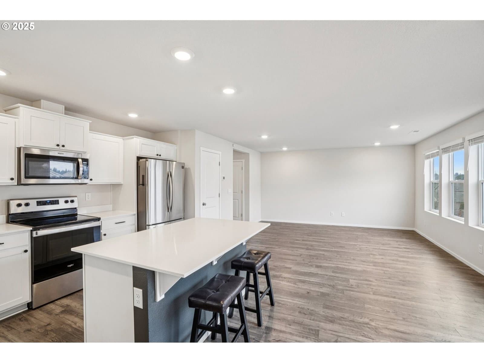 Welcoming covered front porch with keyless entry leads into a bright, open great-room layout with seamless flow between the family room, dining area, and island/breakfast bar kitchen. The family room features recessed lighting and laminate flooring, while the kitchen offers stainless Whirlpool appliances—including a built-in dishwasher, microwave, and glass-cooktop range—plus a stainless Samsung refrigerator. Quartz countertops, abundant cabinetry with display space above, a walk-in pantry, and a generous island with breakfast bar create an ideal space for cooking and gathering. The adjacent dining area provides slider access to the back deck. Upstairs, the primary en-suite includes recessed lighting, LVP flooring, a walk-in closet, and an en-suite bath with single sink quartz vanity and shower. The upper level also hosts three additional bedrooms, a full bath with single sink quartz vanity and combo soak tub and shower, and a dedicated laundry room equipped with a Samsung washer and dryer. A convenient main-level powder room with pedestal sink serves guests. Interior highlights include an open great-room design, island/breakfast bar kitchen, stainless appliances, walk-in pantry, upper-level linen closet, and a blend of laminate, LVP, and carpet throughout. Outside, the home offers a covered front porch, back deck, and a fully landscaped corner lot with sprinklers front and back. The two-car garage adds comfort and practicality to this well-appointed property. Mortgage savings may be available for buyers of this listing.