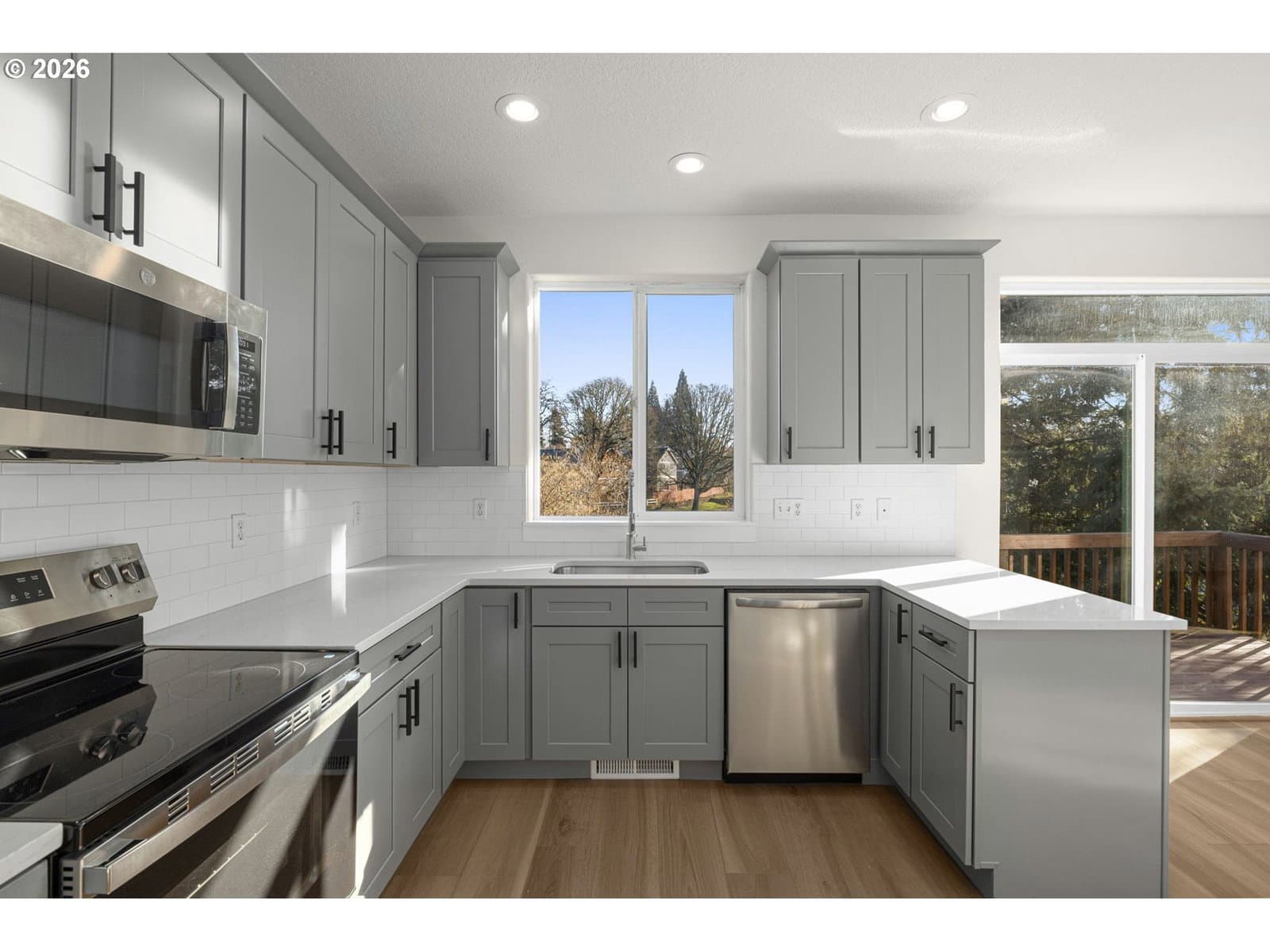 Gorgeous greenbelt private access home with brand new updates including all LVP and carpet, quartz, kitchen cabinets, appliances and fixtures. New paint inside and out, new deck. 2 story soaring vaults with windows to marvel in your private expanse. Wake with the sunrise from your deck overlooking the creek and wetlands. Seller is a licensed real estate agent in the State of Oregon. This is MOVE-IN ready and won't last long.