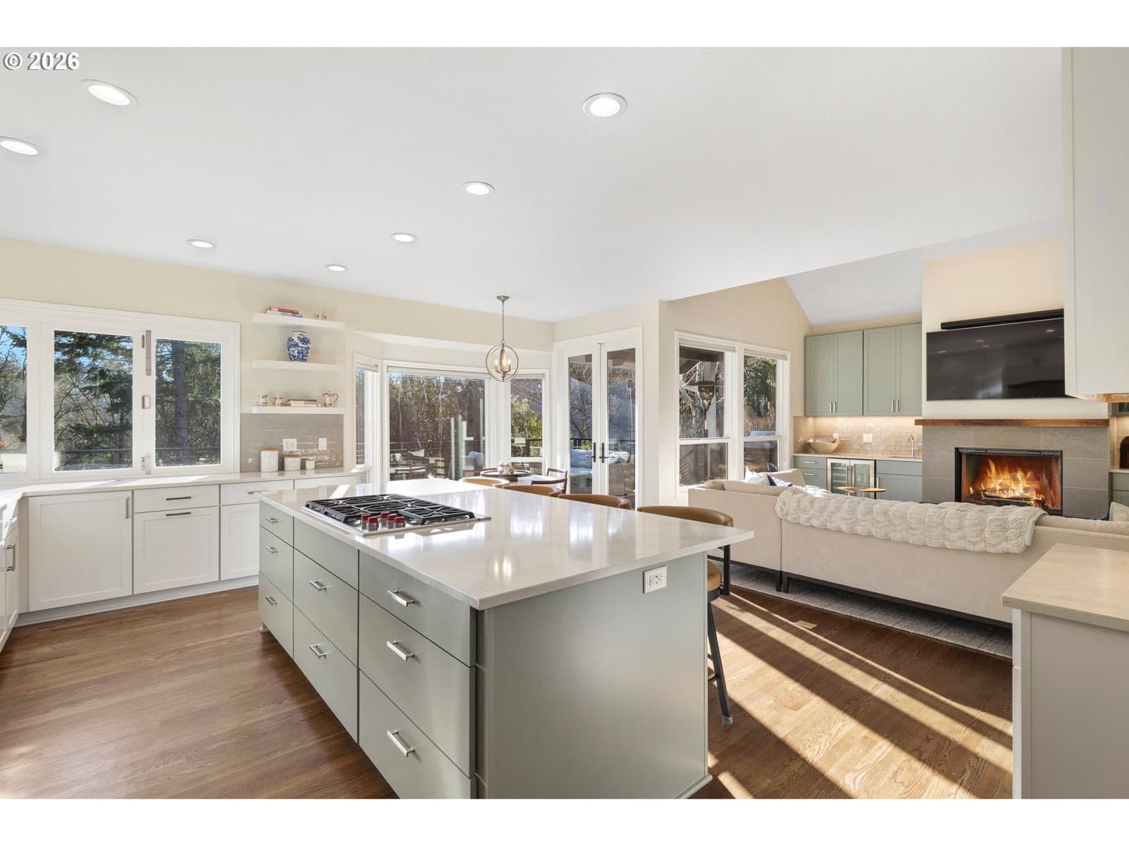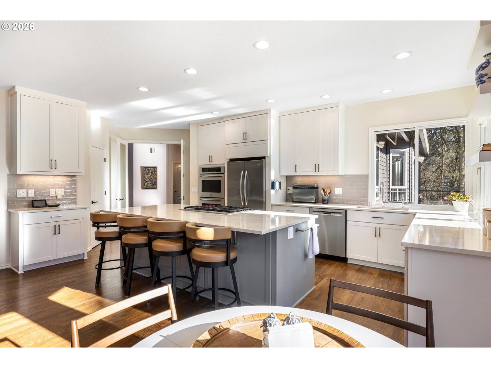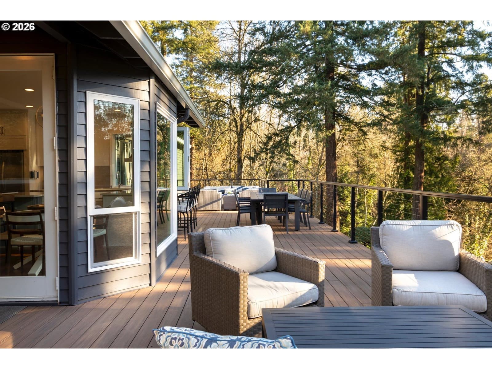 This stunning traditional sits on nearly a third of an acre at the end of a quiet cul-de-sac in the highly desirable Bridlemile neighborhood. A one of a kind floor plan and head to toe remodel that is meticulously maintained and enjoys a forest like green space off the back. The main level features a show stopping kitchen that has all new cabinets, quartz countertops, tile backsplash, a Wolf cooktop, a massive island, a walk in pantry, a breakfast nook, and a one of kind bifold window for access to the outside bar. The family room has a stunning custom gas starter fireplace with builtin cabinets, a beverage and wine fridge and expansive windows. The hard to find primary on the main enjoys high ceilings, deck access and an elegantly updated bathroom with two vanities, a free standing tub, a tile steam shower, and a walk-in closet with a high end custom builtins. The rest of the main level features a cozy den, an entertainer’s dining room, a large formal living room with a gas starter fireplace, a powder bathroom, and a functional laundry room equipped with a sink, fridge and ample counter and cabinet space. The upper level comes with three spare bedrooms, two beautifully updated bathrooms, and a large bonus room that can serve multiple purposes. The one of a kind exterior enjoys a stunning green belt and creek, mature trees and shrubs, and a large flat grass area perfect for outdoor activities. Entertaining is a dream with the new composition deck stretching nearly the entire width of the home, an outdoor bar, a covered area for all weather enjoyment and a inviting fire pit. The massive crawlspace is accessed with a standard size door and is perfect for storage, a shop or opportunity to finish for additional living space. Rest easy with the newer 50 year roof, oversized 3 car garage, high end cedar siding, fresh interior & exterior paint & more! Top of the line schools and only minutes from Hamilton Park, Multnomah Village, Oregon Zoo, OHSU, major highways & trails! [Home Energy Score = 2. HES Report at https://rpt.greenbuildingregistry.com/hes/OR10243711]