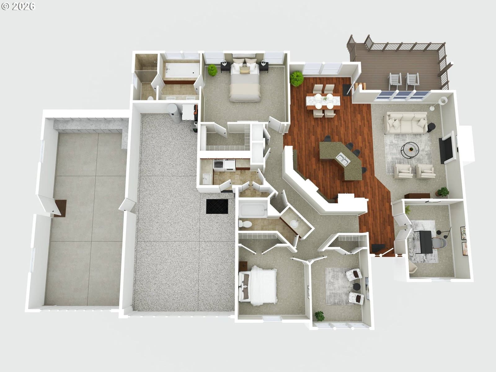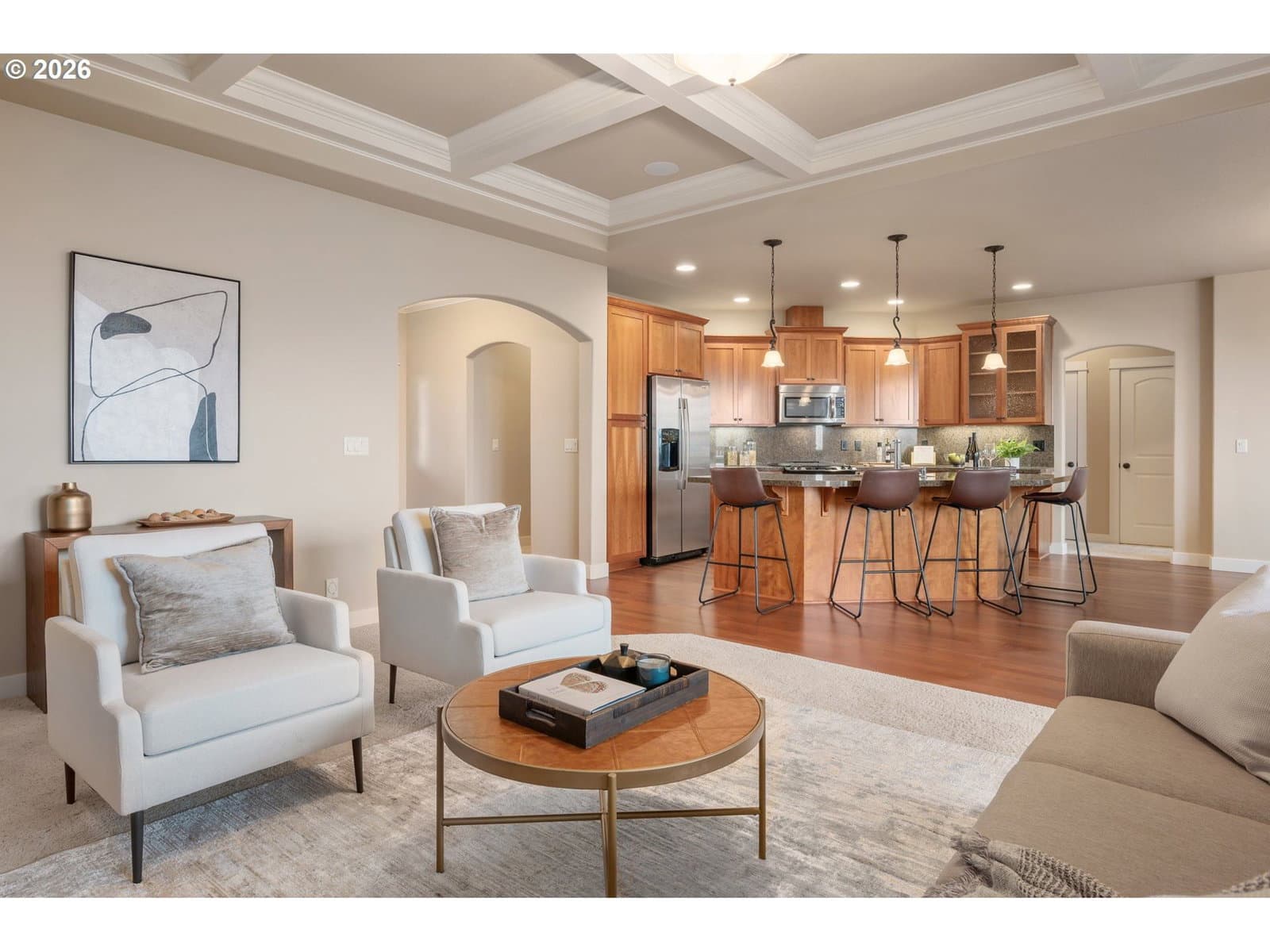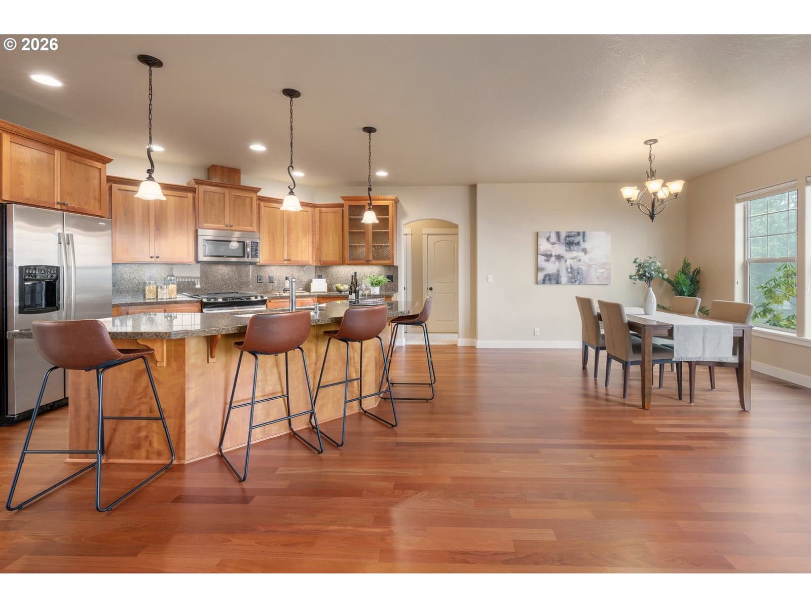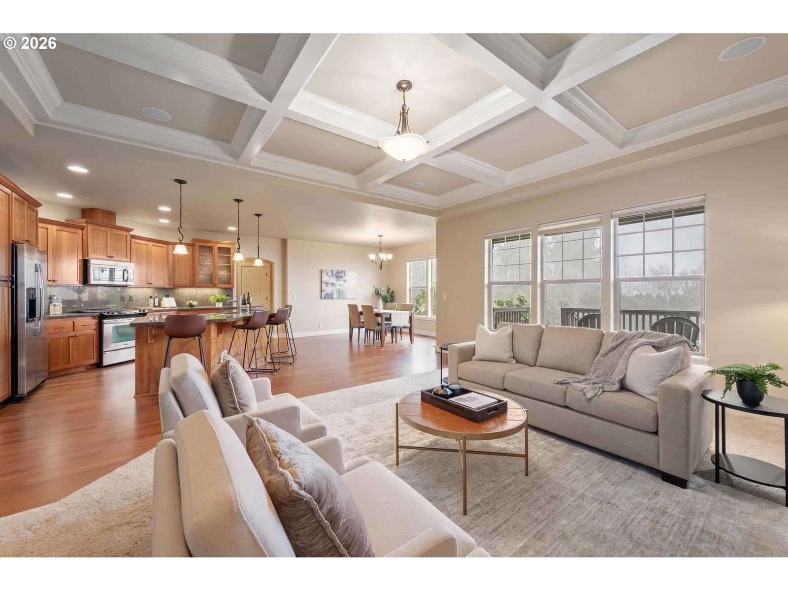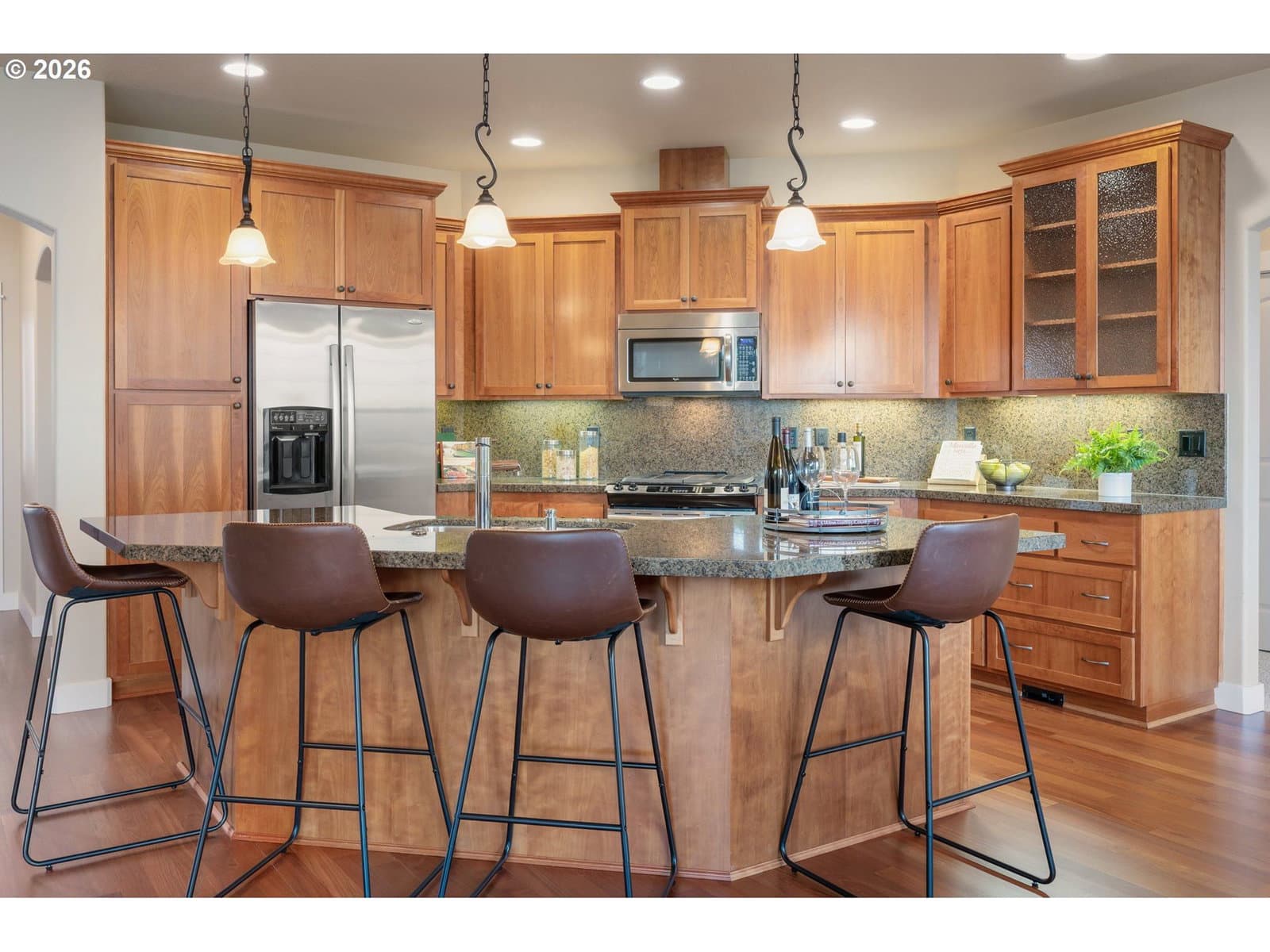 Open House Sat 1/24 and Sun 1/25 from 1-3pm! Welcome to this immaculately maintained, 1-level home w/ a 5-car garage and sunny yard in Mountaingate! Built by locally-renowned Bruce Wiechert Custom Homes and ready to impress the most discerning buyers, this thoughtfully designed, single-owner residence delivers an exceptional living experience. 9-foot ceilings create an airy atmosphere throughout, while elegant cherry hardwood floors grace the entry, kitchen, and dining areas. The great room concept shines with a stunning box beam ceiling and cozy gas fireplace, perfect for gathering with loved ones. The chef's kitchen features granite countertops, stainless steel appliances, cherry cabinetry, and a functional island with eating bar. Your private primary ensuite features a spa-like bathroom with soaking tub, dual vanity, and walk-in tile shower. You'll love the separation of the 2 guest bedrooms and the convenient home office. Car enthusiasts and hobbyists will marvel at the 1000+ sqft garage featuring ten-foot ceilings, epoxy flooring, built-in workbench, and dedicated welder outlet. And you still get gated RV Parking!Step outside to enjoy views of the Coburg Hills from your level, beautifully landscaped .27 acre yard. The covered deck and porch provide ideal spots for morning coffee or evening relaxation. Perfectly sited on the best street in the coveted Mountaingate community right across from a large, grassy common area.