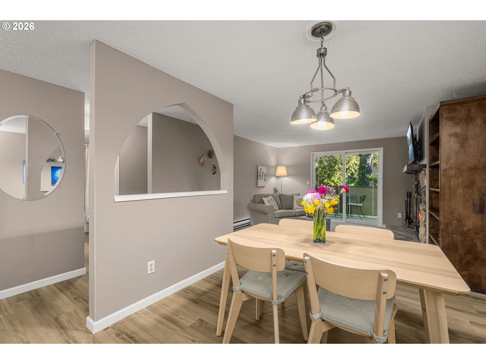 Enjoy easy one-level living in Wilsonville in this beautifully updated condo surrounded by greenery. Tucked into a quiet, tree-lined setting, this home offers a peaceful retreat with unbeatable convenience. New flooring runs throughout, complementing the refreshed kitchen with a tile backsplash and new stainless Energy Star appliances, including a built-in microwave and dual drawer dishwasher. The living room offers warmth and character with a cozy wood-burning fireplace, built-in bookcases, and a sliding glass door opening to a private balcony that overlooks peaceful trees and greenspace, and offers extra storage. Two comfortable bedrooms offer great closet space, and the home includes the convenience of an in-unit washer and dryer. Located just minutes from shopping, dining, parks, and the town center, this home also includes a dedicated parking space and access to community amenities such as a fitness center, weight room, and pool. The HOA covers water, commons, exterior maintenance, grounds maintenance, insurance, sewer, and trash.