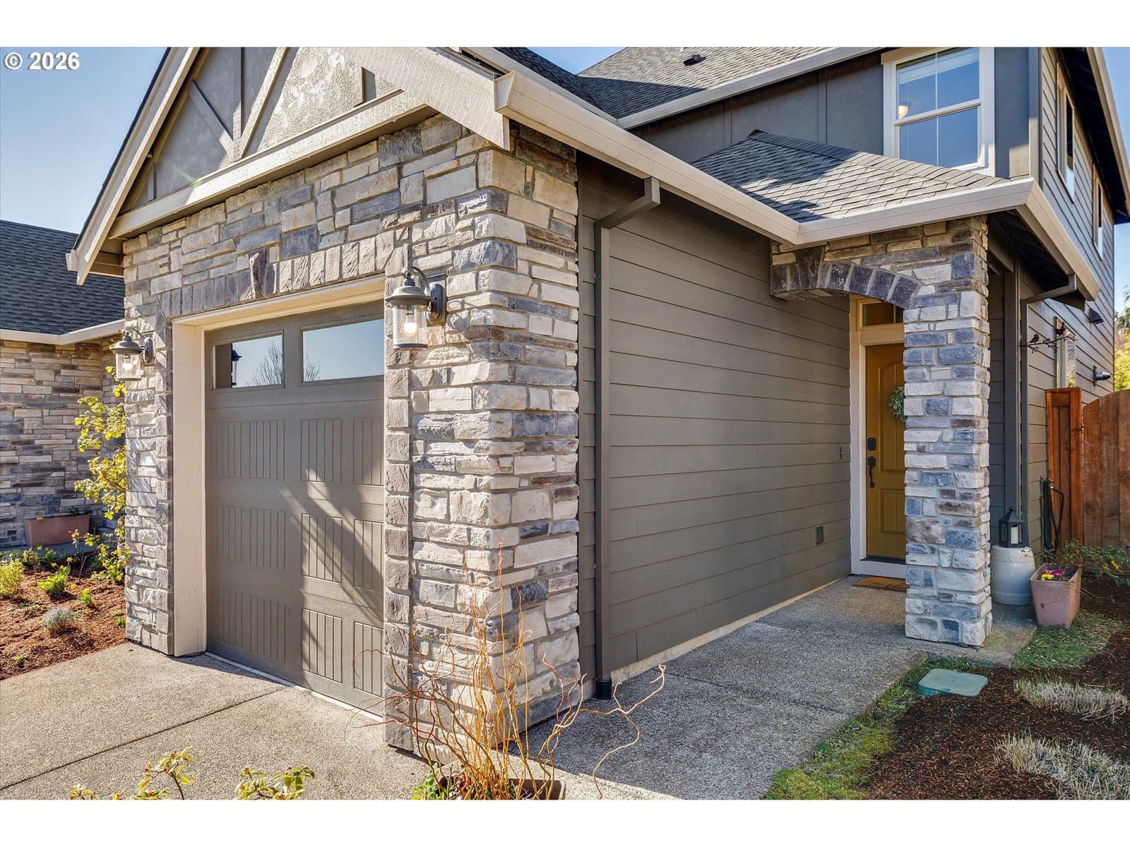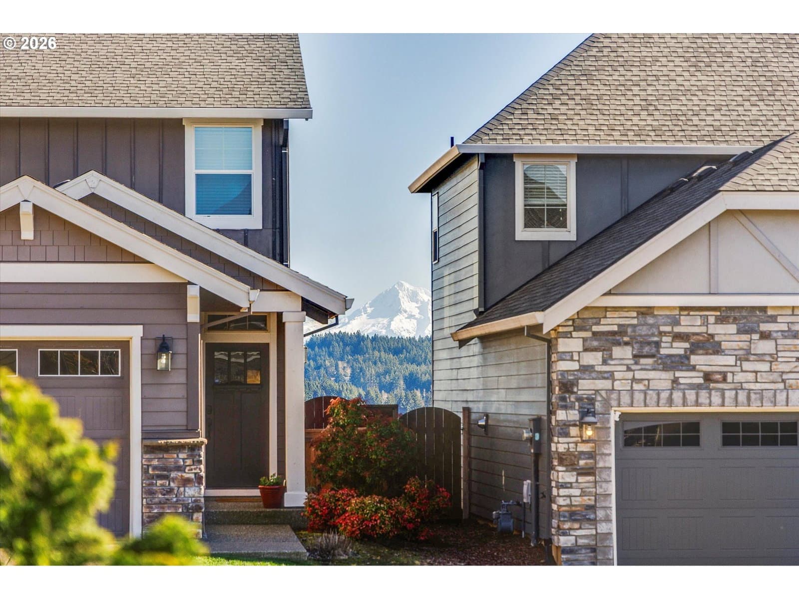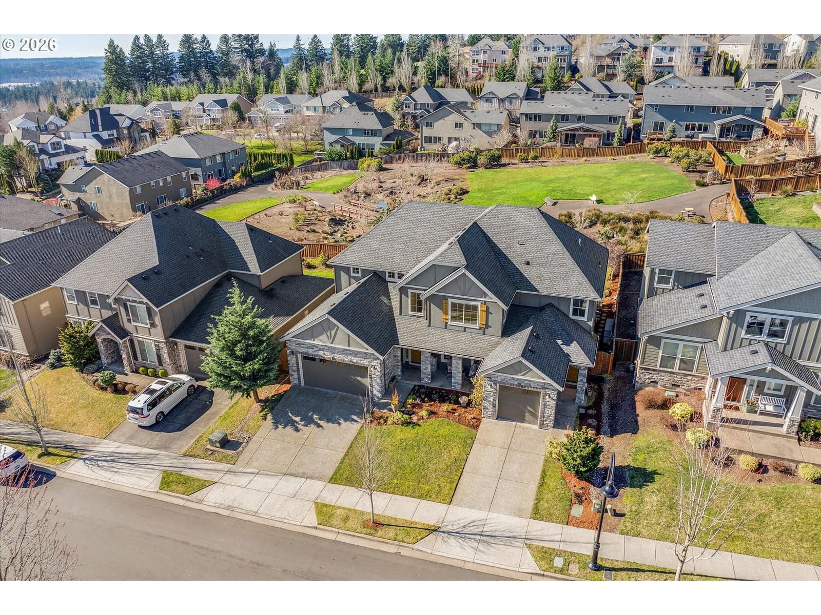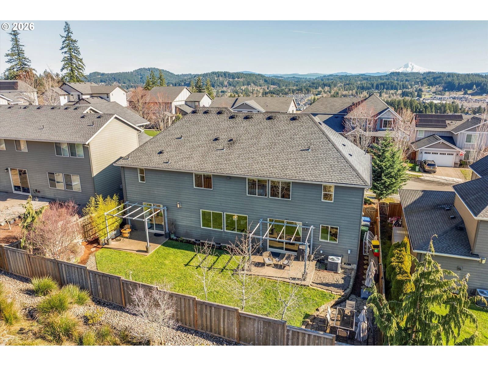 Built in 2015, this stunning 3,899 sq ft home offers a rare layout with an attached fully self contained 722 sq ft Multi-Generational Suite. This ground level suite is very private with its own entrance, dedicated garage, backyard with patio, pergola and sun-shade. Also includes 1 bedroom and on-suite bathroom, 15x13 spacious living room, stackable washer and dryer, generous kitchen with custom island and Brava oven & control over your own heat & AC, separate tankless water heater and engineered wood floors. This versatile space is ideal for multi-generational living, guests, college students, or add'l entertaining space for the home. The main home features 3176 sq ft, engineered wood floors on the main, EXPANSIVE kitchen/great-room concept, full of light, gas fireplace w/ built-ins and & 9 ft ceilings. Upstairs features 20X15 bonus loft room, primary suite with double sinks, & HUGE walk-in closet + an additional 3 bedrooms and 2 bathrooms (one Jack-n-Jill), large laundry room and plenty of storage thru-out the home. Located in a premier Happy Valley neighborhood with territorial backyard and Mt Hood view from upstairs & multi-gen suite front porch. Private HOA Park directly behind home. Enjoy the proximity to New Seasons, restaurants, trails, nature & 205....A truly one-of-a-kind opportunity offering space, privacy, and flexibility in an unbeatable location. All appliances are included.