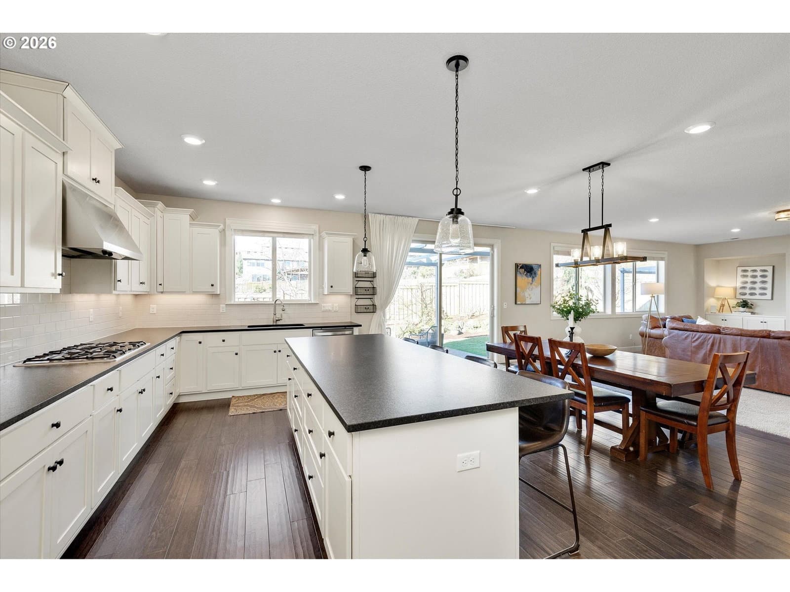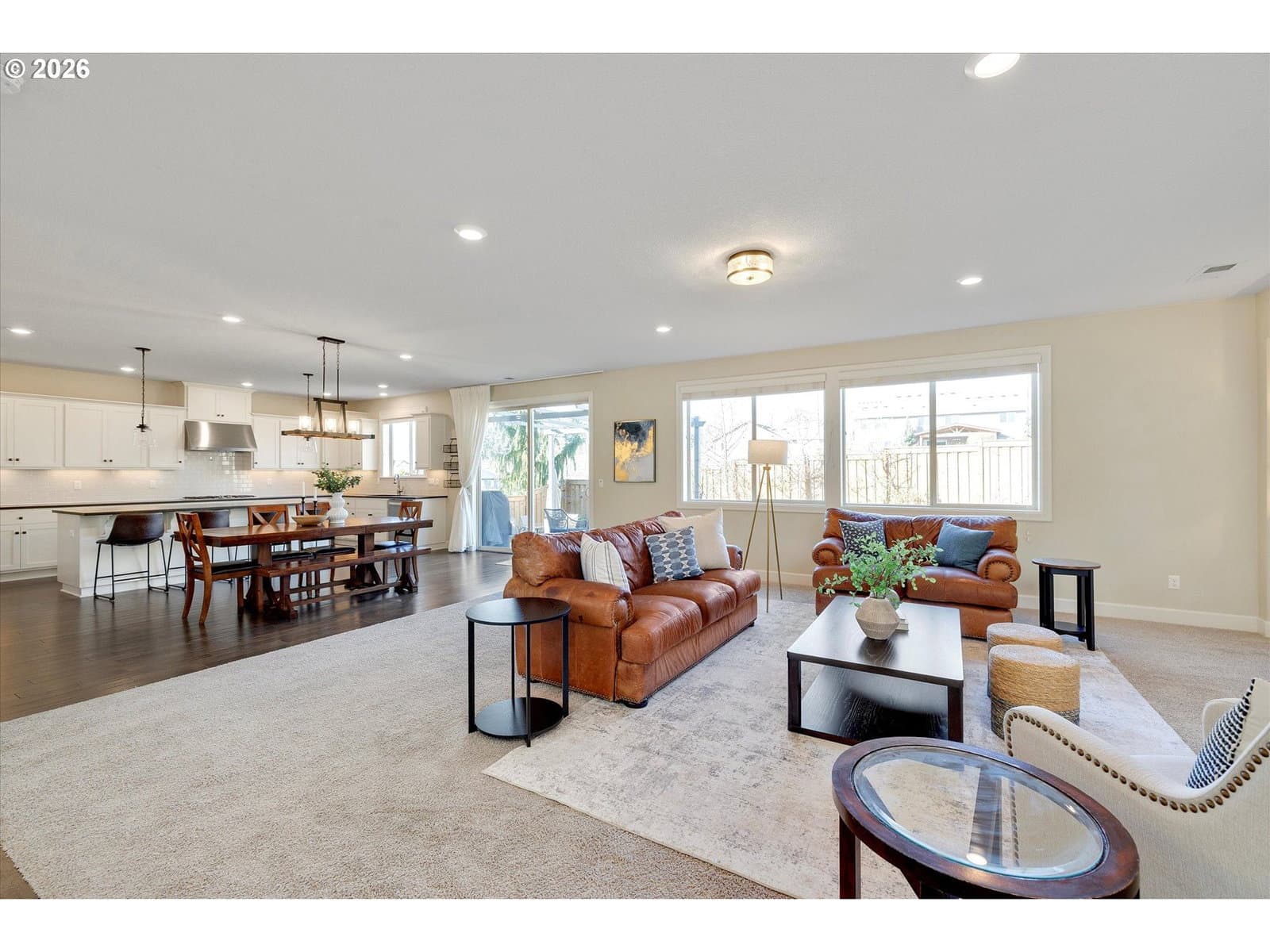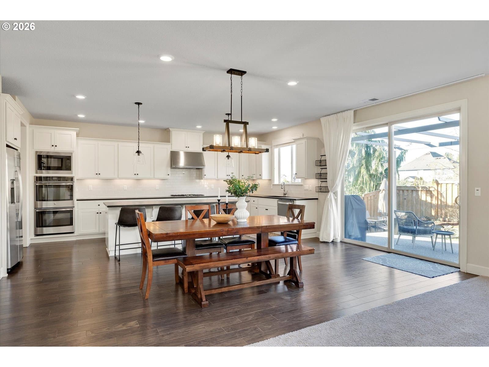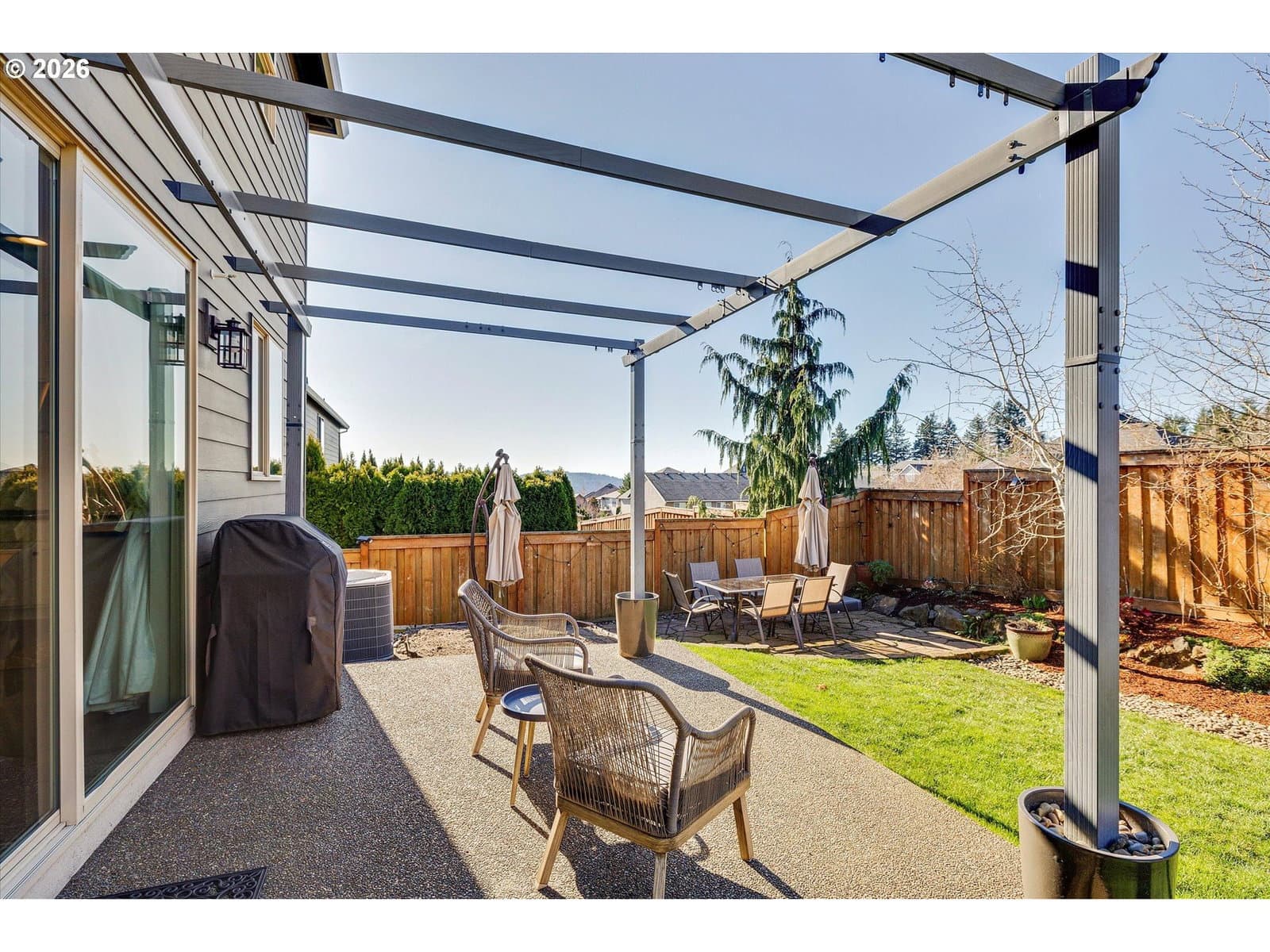 Built in 2015, this stunning 3,899 sq ft home offers a rare layout with an attached fully self contained 722 sq ft Multi-Generational Suite. This ground level suite is very private with its own entrance, dedicated garage, backyard with patio, pergola and sun-shade. Also includes 1 bedroom and on-suite bathroom, 15x13 spacious living room, stackable washer and dryer, generous kitchen with custom island and Brava oven & control over your own heat & AC, separate tankless water heater and engineered wood floors. This versatile space is ideal for multi-generational living, guests, college students, or add'l entertaining space for the home. The main home features 3176 sq ft, engineered wood floors on the main, EXPANSIVE kitchen/great-room concept, full of light, gas fireplace w/ built-ins and & 9 ft ceilings. Upstairs features 20X15 bonus loft room, primary suite with double sinks, & HUGE walk-in closet + an additional 3 bedrooms and 2 bathrooms (one Jack-n-Jill), large laundry room and plenty of storage thru-out the home. Located in a premier Happy Valley neighborhood with territorial backyard and Mt Hood view from upstairs & multi-gen suite front porch. Private HOA Park directly behind home. Enjoy the proximity to New Seasons, restaurants, trails, nature & 205....A truly one-of-a-kind opportunity offering space, privacy, and flexibility in an unbeatable location. All appliances are included.