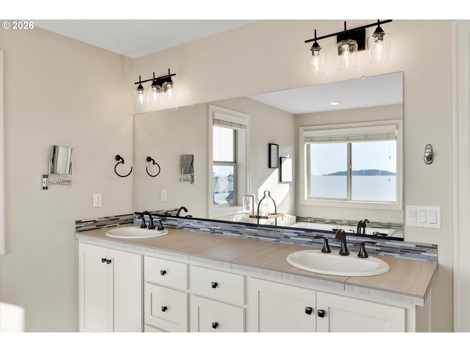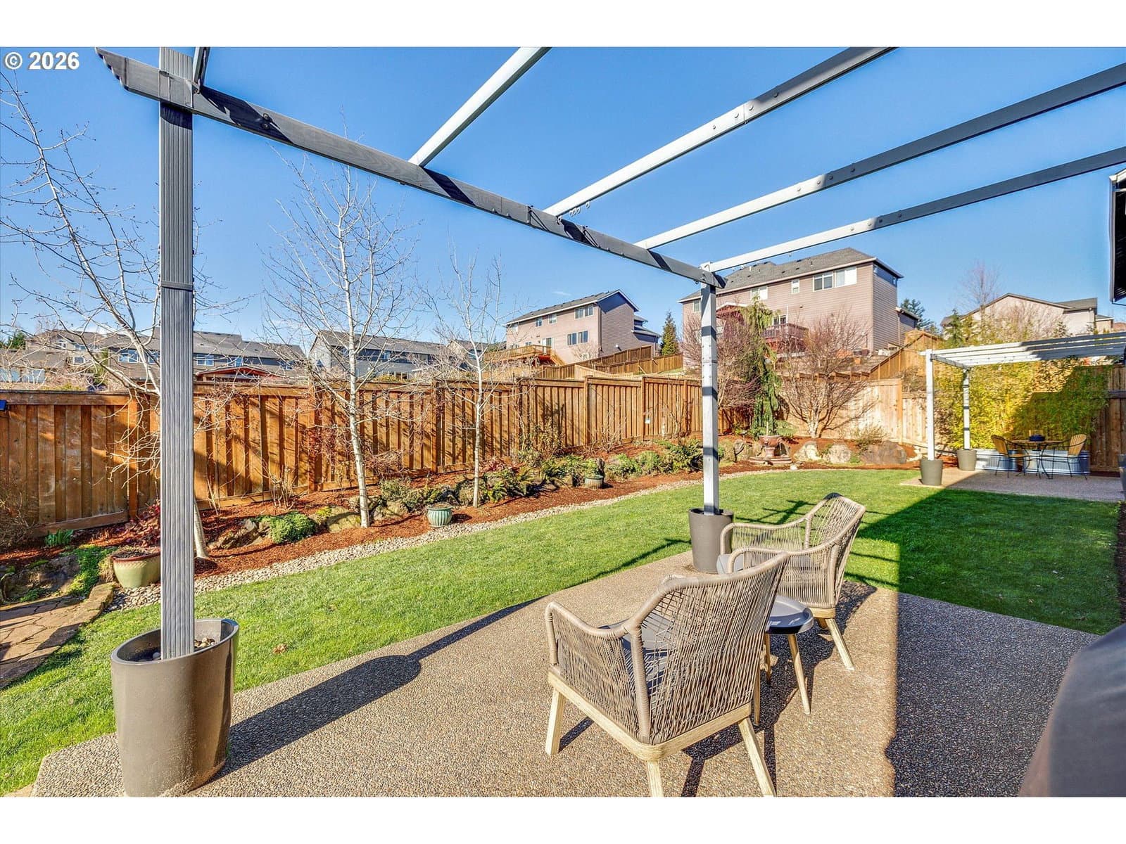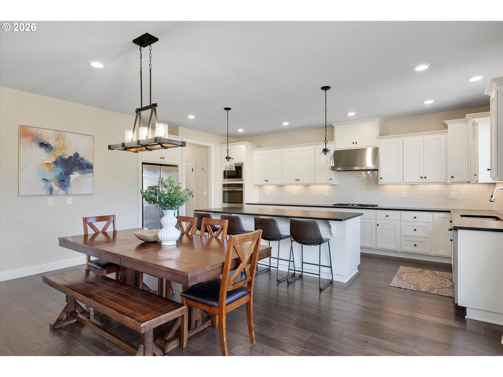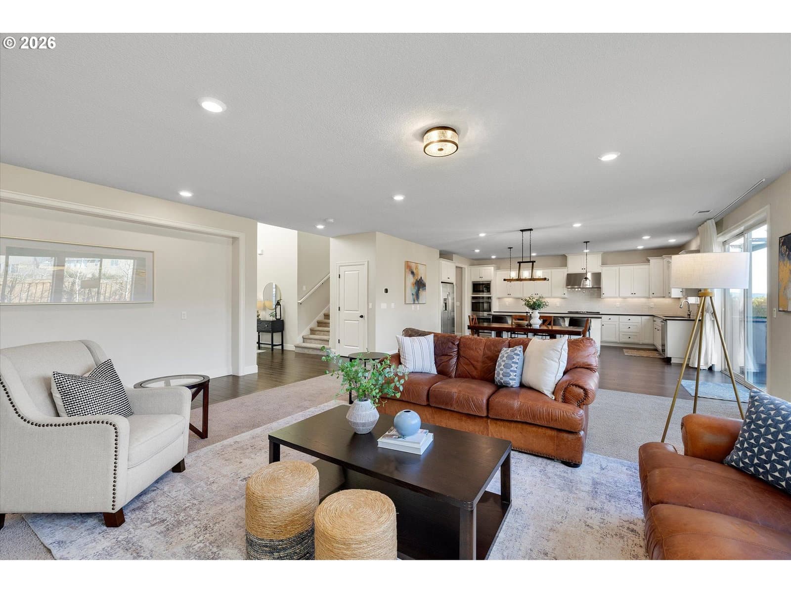 Built in 2015, this stunning 3,899 sq ft home offers a rare layout with an attached fully self contained 722 sq ft Multi-Generational Suite. This ground level suite is very private with its own entrance, dedicated garage, backyard with patio, pergola and sun-shade. Also includes 1 bedroom and on-suite bathroom, 15x13 spacious living room, stackable washer and dryer, generous kitchen with custom island and Brava oven & control over your own heat & AC, separate tankless water heater and engineered wood floors. This versatile space is ideal for multi-generational living, guests, college students, or add'l entertaining space for the home. The main home features 3176 sq ft, engineered wood floors on the main, EXPANSIVE kitchen/great-room concept, full of light, gas fireplace w/ built-ins and & 9 ft ceilings. Upstairs features 20X15 bonus loft room, primary suite with double sinks, & HUGE walk-in closet + an additional 3 bedrooms and 2 bathrooms (one Jack-n-Jill), large laundry room and plenty of storage thru-out the home. Located in a premier Happy Valley neighborhood with territorial backyard and Mt Hood view from upstairs & multi-gen suite front porch. Private HOA Park directly behind home. Enjoy the proximity to New Seasons, restaurants, trails, nature & 205....A truly one-of-a-kind opportunity offering space, privacy, and flexibility in an unbeatable location. All appliances are included.