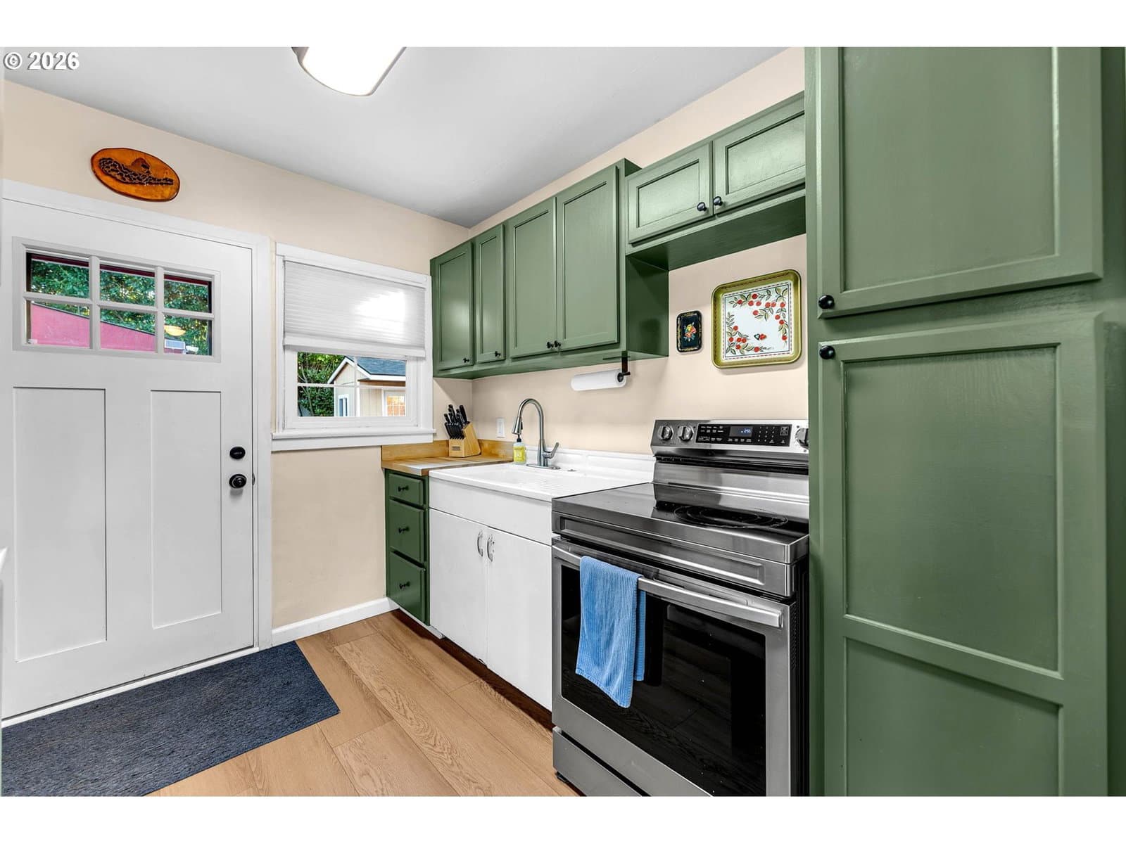 Charming move-in ready bungalow with detached garage and 2nd driveway with portable carport, perfect for storage and RV parking. Home has been updated throughout with newer LVP flooring. Remodeled kitchen with pantry area, including a Stainless Steel fridge and stackable washer/dryer. Dining room with built-in bench seating. Updated bathroom with tile floor. Newer hot water heater. Private fenced back yard with an adorable garden shed.